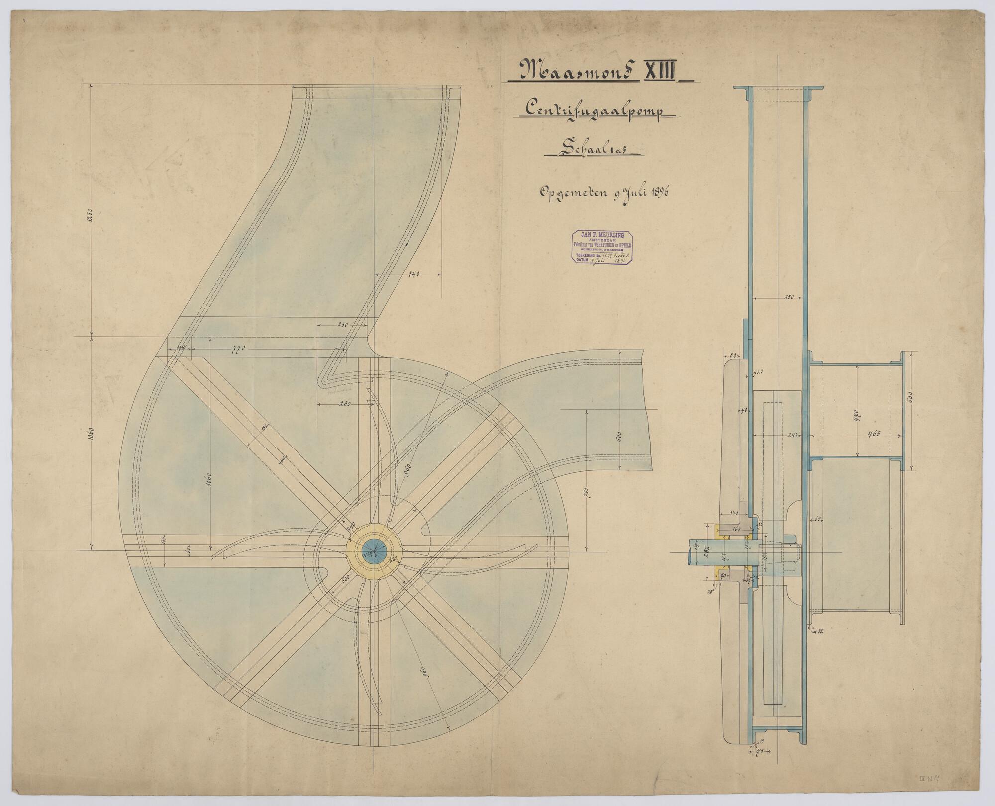 Verticale langsdoorsnede, dwarsdoorsnede en Centrifugaal pomp 1886 voor Maasmond XIII.