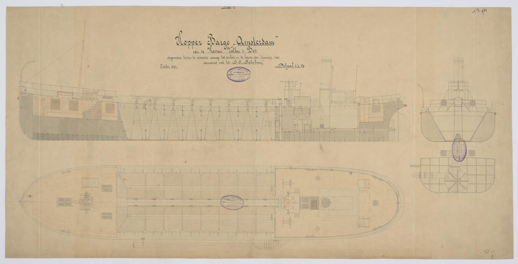 Verticale langsdoorsnede, bovenaanzicht en dwarsdoorsnede van de hopperbarge Amsterdam.