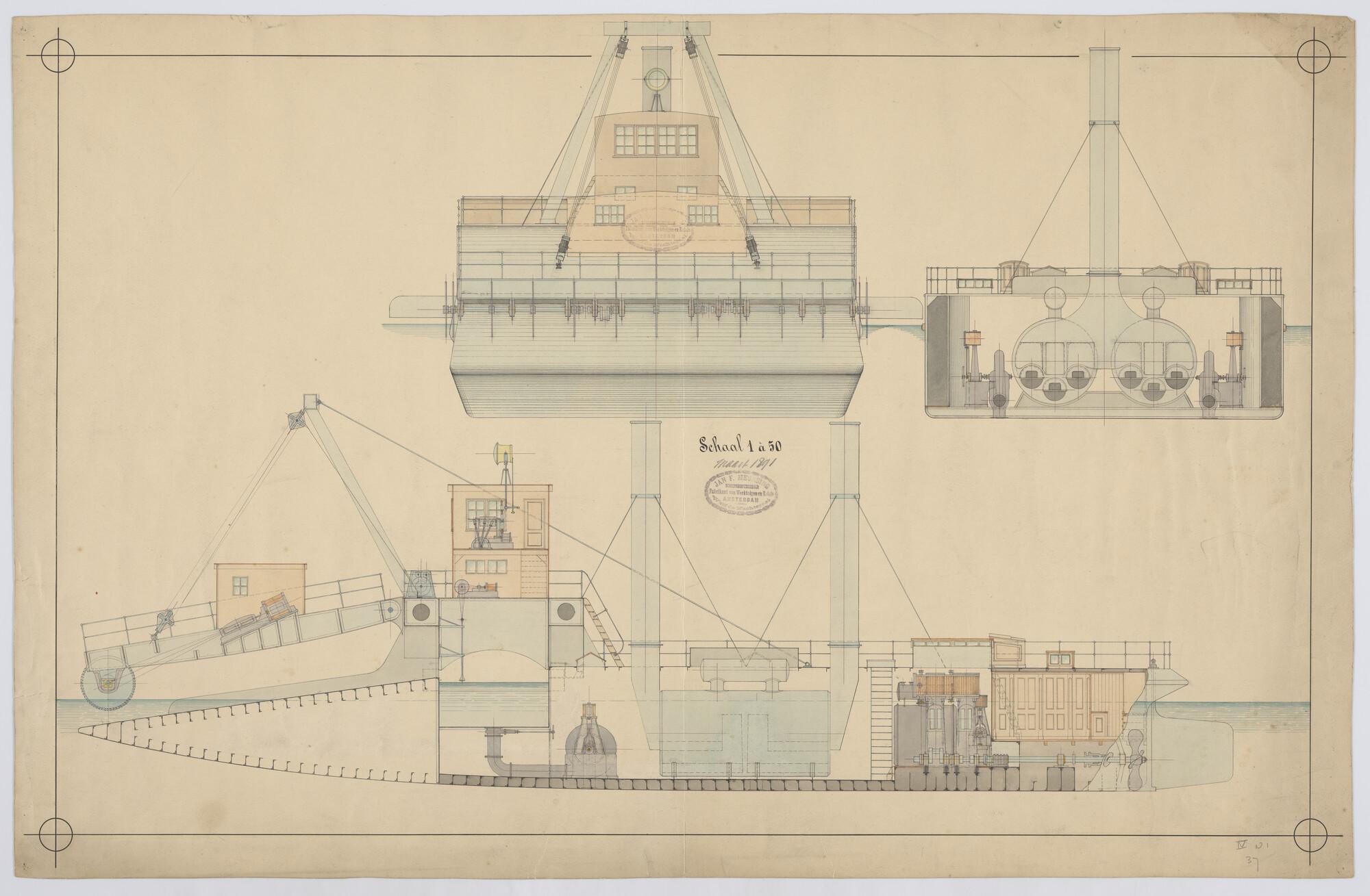 Verticale langsdoorsnede, dwarsdoorsnede en vooraanzicht van een stoomijsruimer 1891.
