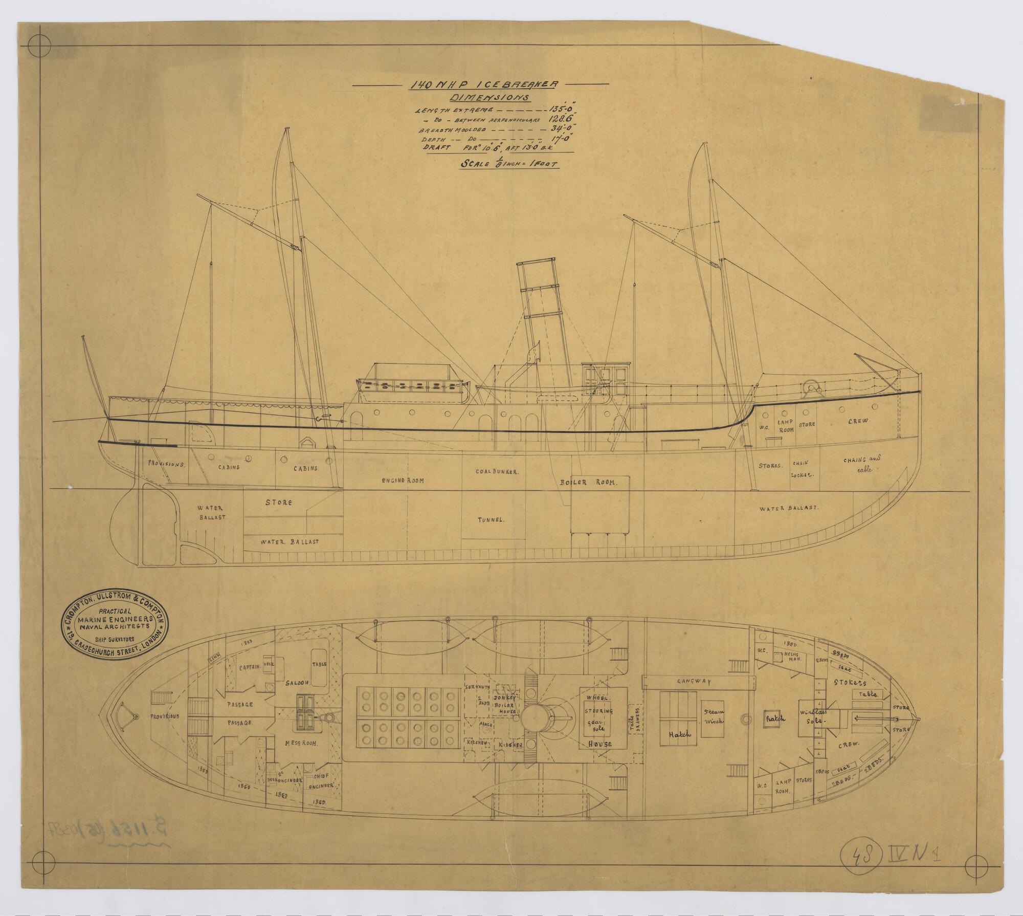 Verticale langsdoorsnede en horizontale langsdoorsnede van een ijsbreker.