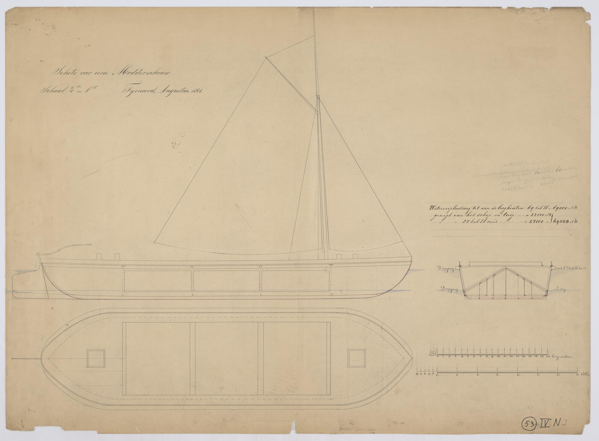 Zijaanzicht en bovenaanzicht Modderschouw met zeiltuig 1861