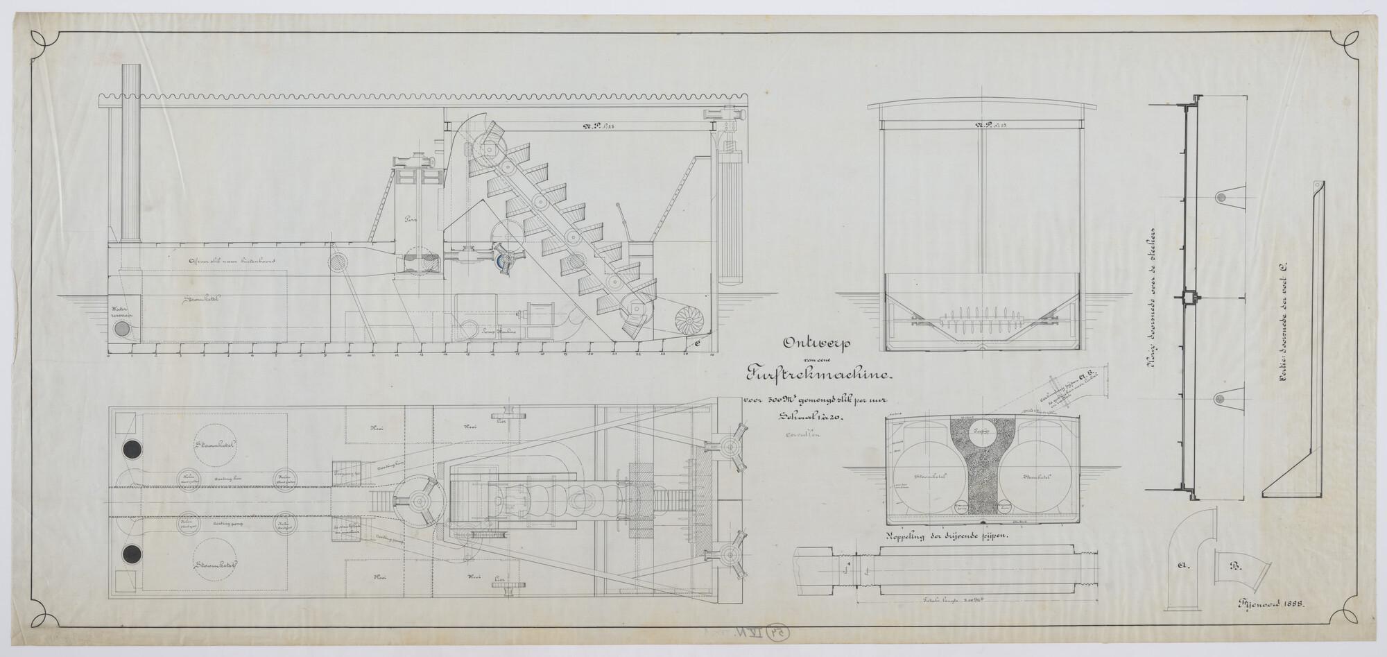 Zijaanzicht, bovenaanzicht, vooraanzicht en dwarsdoorsnede van een turftrek machine 1888.