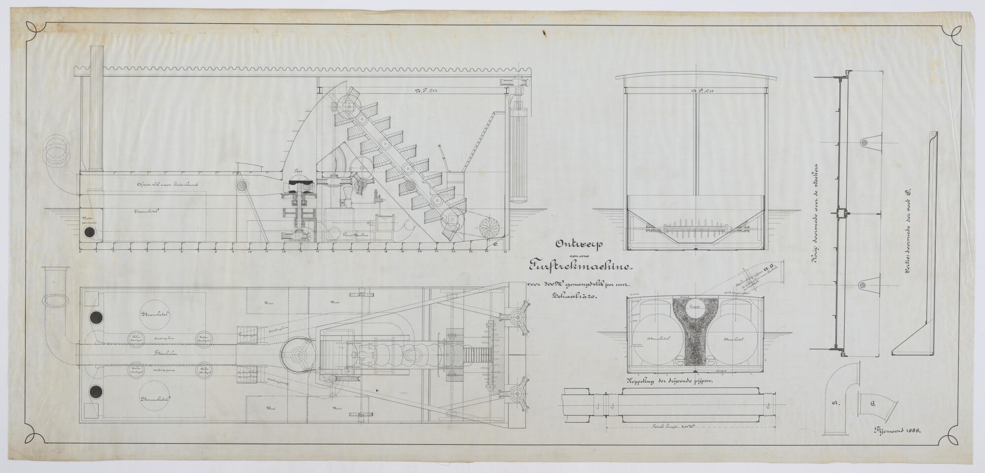 Zijaanzicht, bovenaanzicht, vooraanzicht en dwarsdoorsnede van een turftrek machine 1888.