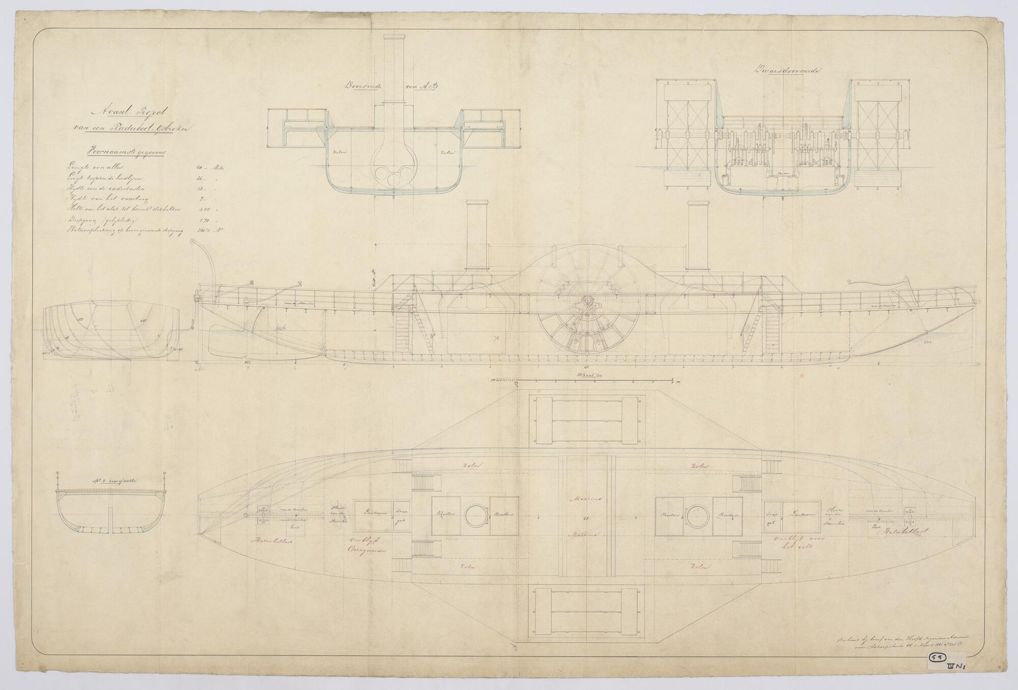Zijaanzicht, bovenaanzicht, spantenraam en dwarsdoorsnede van raderboot IJsbreker, 1881, afmetingen 40 x 13 x 3.44 meter.