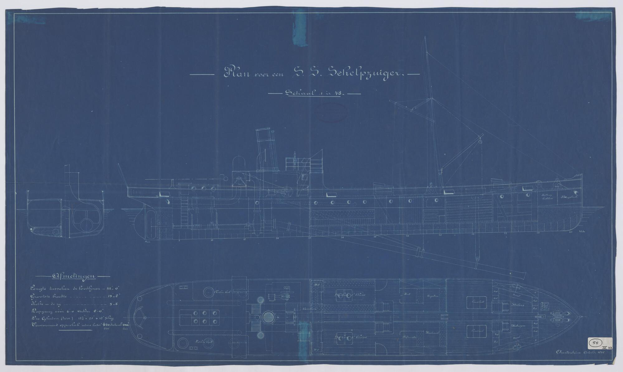 Zijaanzicht, BD, bovenaanzicht, horizontale langsdoorsnede en dwarsdoorsnede van een Stoomschelpenzuiger 1895, afmetingen 111 x 19.8 x 9.6 voet.