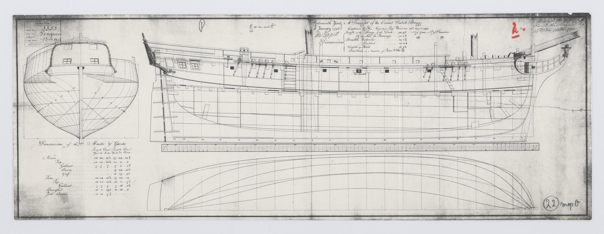 Oorlogsschip "Penguin" (ex- Komeet") 16 st. (1790): zijaanzicht, verticale langsdoorsnede, achteraanzicht, senten en waterlijnen