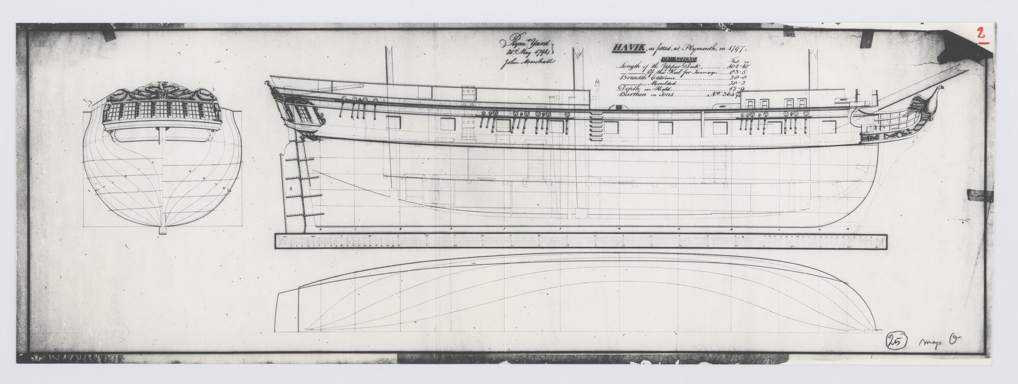 Oorlogsschip "Havik": zijaanzicht, verticale langsdoorsnede, achteraanzicht, spantenraam en waterlijnen.