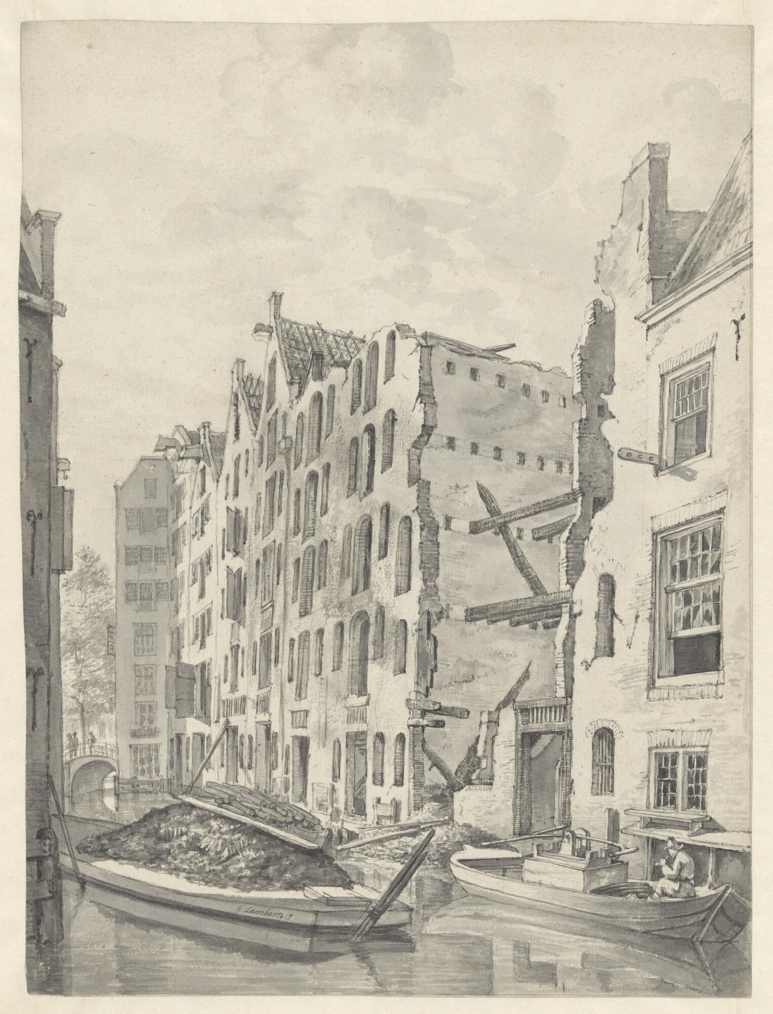 Het Kattegat te Amsterdam na de brand van de Nieuwe Lutherse Kerk, 1822