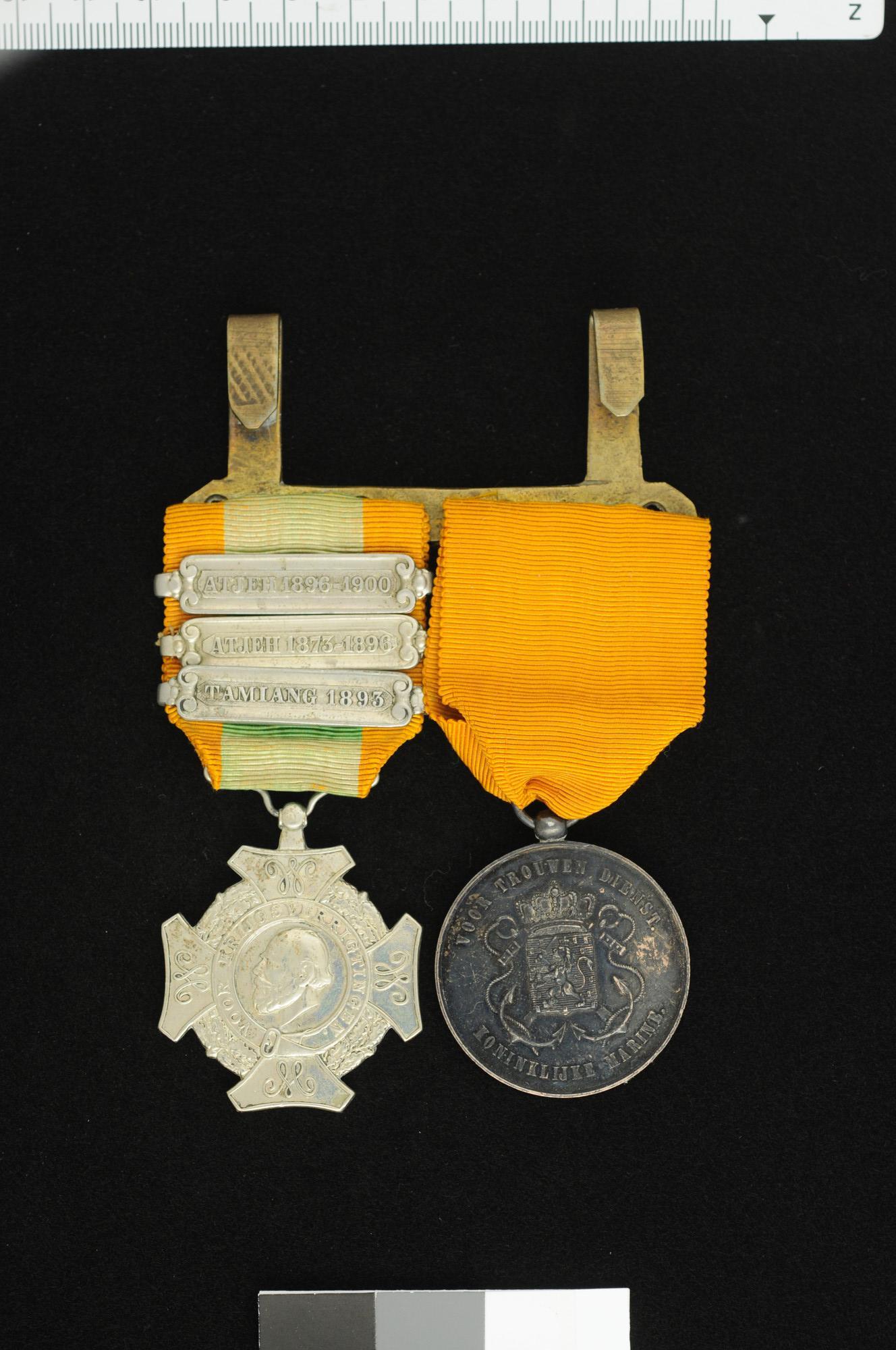 Gesp met twee onderscheidingen: Ereteken voor Belangrijke Krijgsbedrijven, ook wel Expeditiekruis of Kruis voor Krijgsverrichtingen genoemd, met drie gespen en het Onderscheidingsteken voor langdurige, eerlijke en trouwe dienst bij de Zeemacht in zilver.