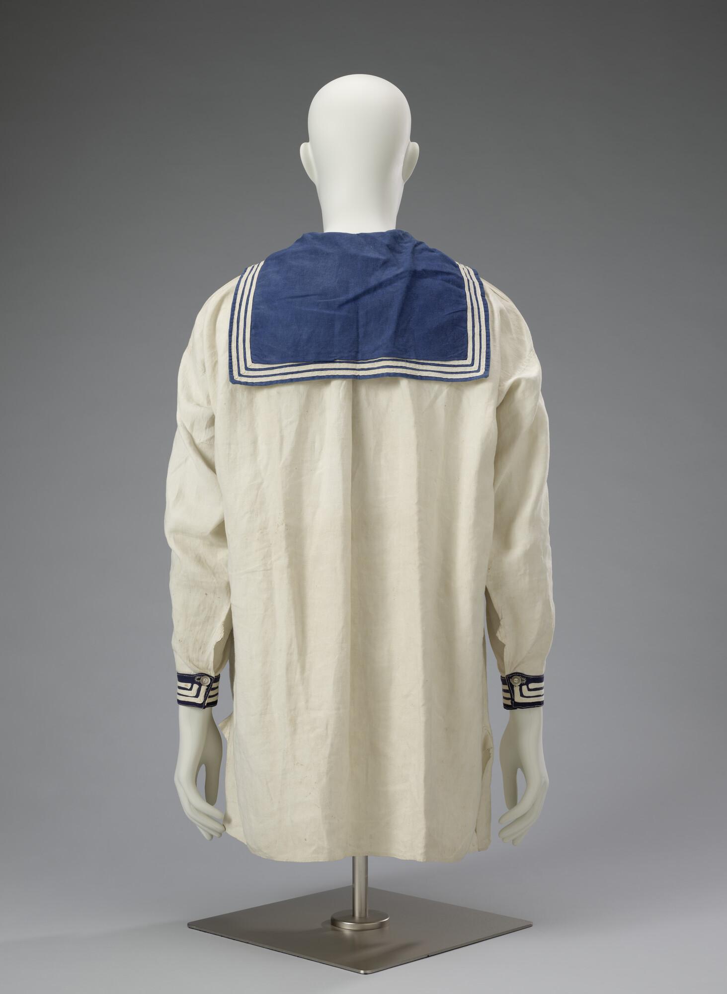 Uniformkiel, zgn baadje, wit met blauwe kraag. Onderdeel van het matrozenuniform van de Koninklijke marine, gedragen door J.B. Richter, lichting 1901 (later derde, tweede en eerste stuurman van de KPM).