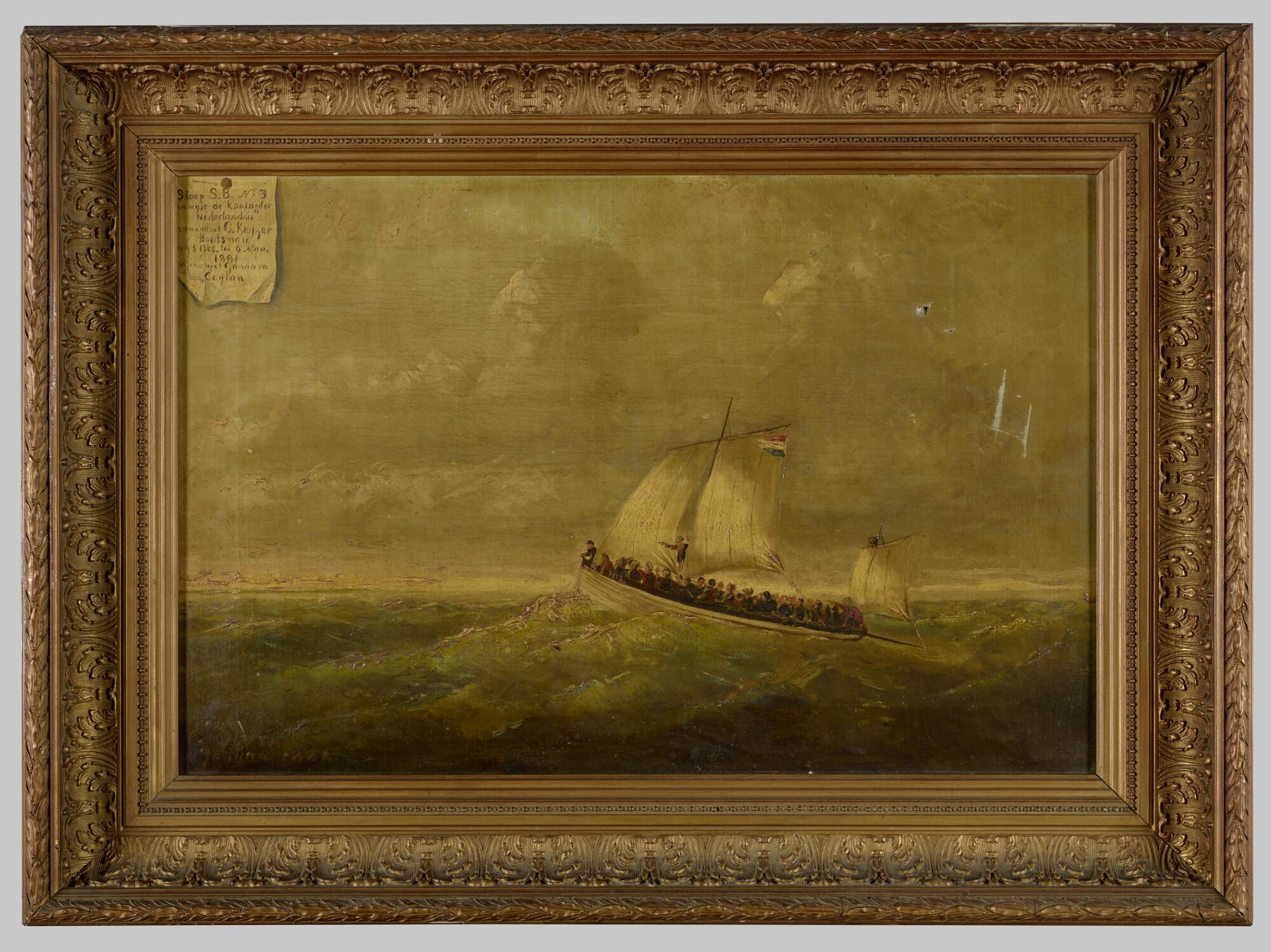 Sloep SB nummer 3 van de Koning der Nederlanden op zee met bemanning en onder zeil. In de linkerhoek een briefje als trompe l'oeuil.