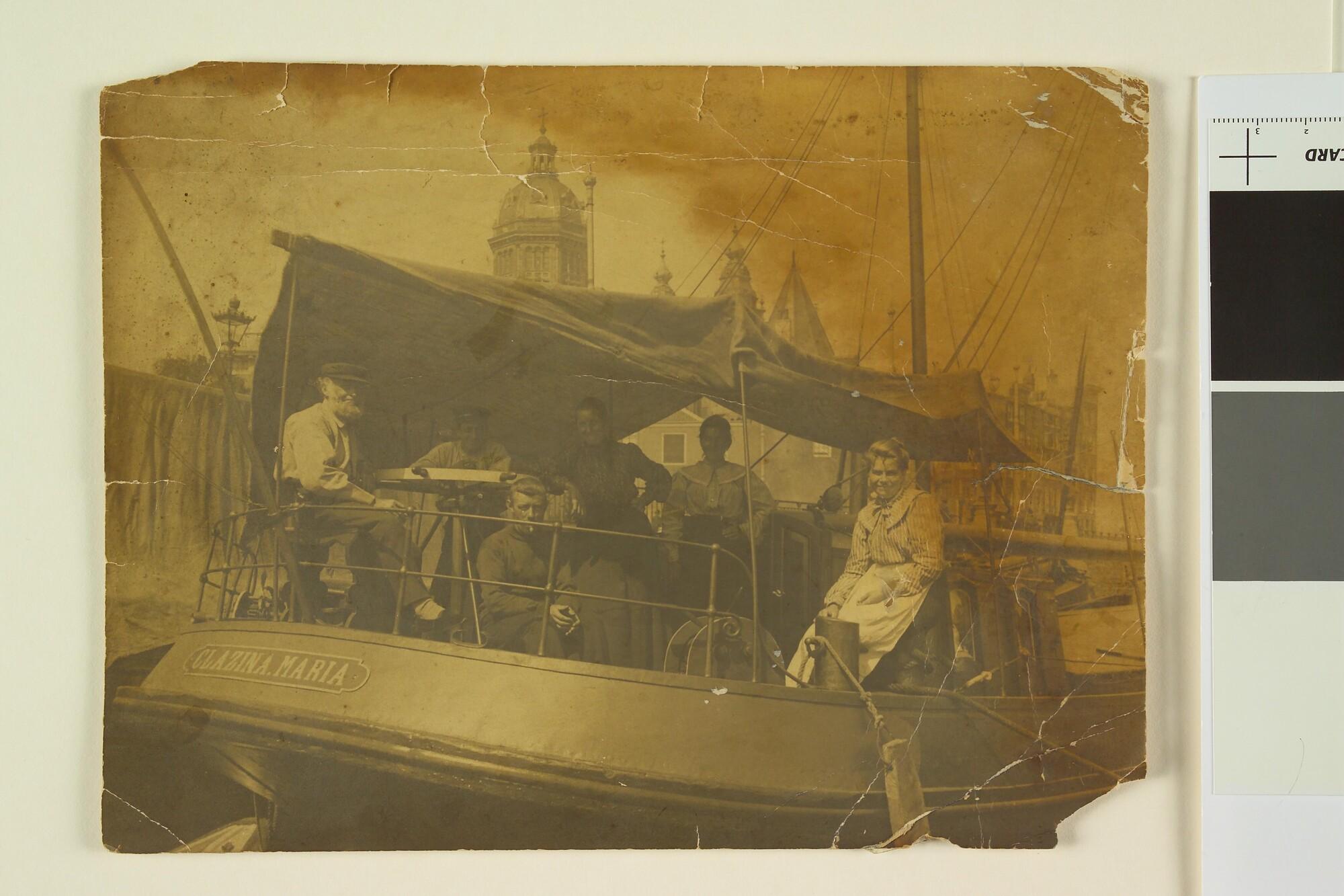 Portretfoto van een familie op het achterdek van de 'Clazina Marina', afgemeerd voor de Schreierstoren in Amsterdam