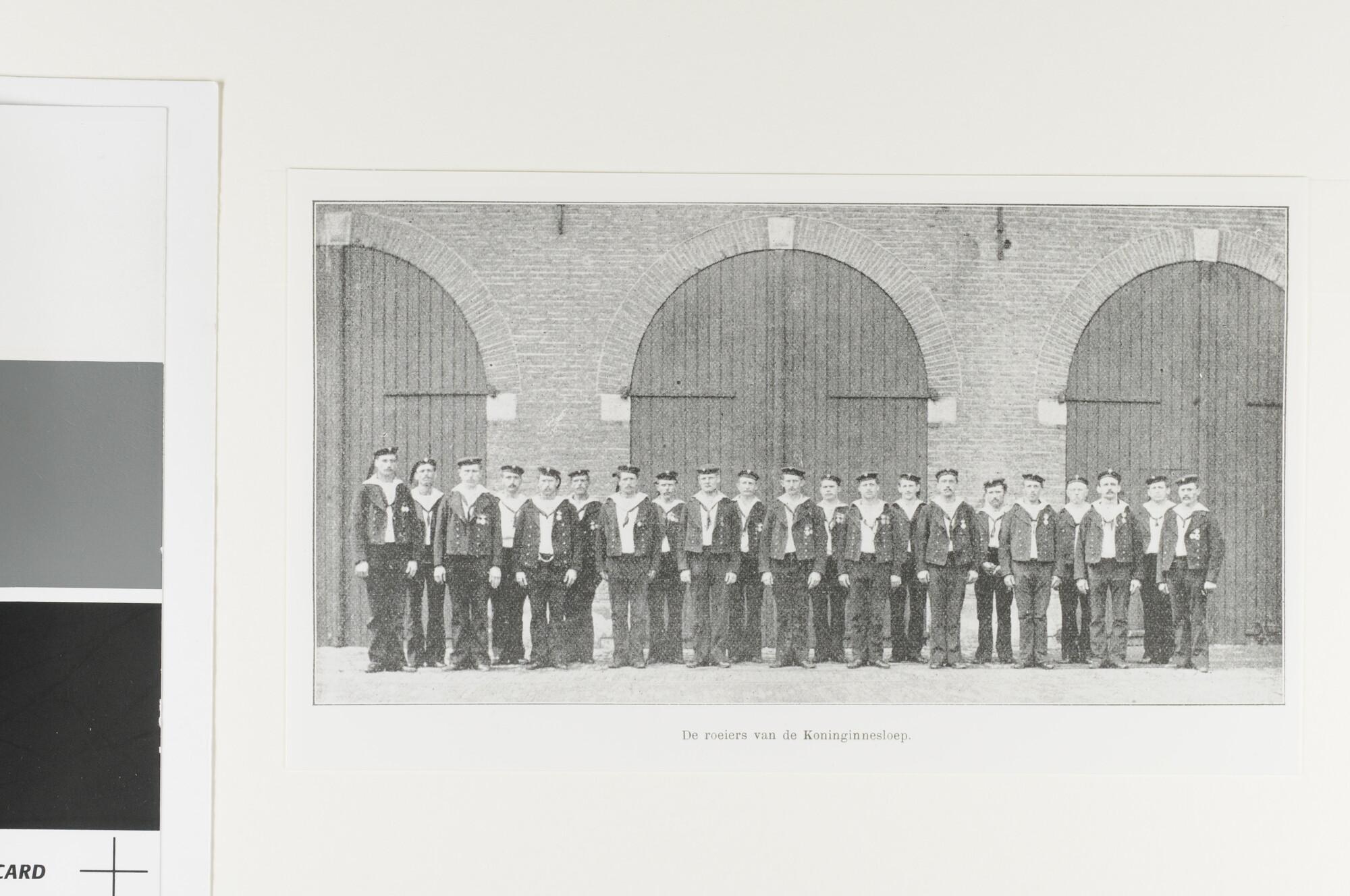 'De roeiers van de koninginnesloep': Matrozen der 1e klasse afkomstig van het logementschip Hr.Ms. "Buffel" te Hellevoetsluis. [Reproductiefoto]