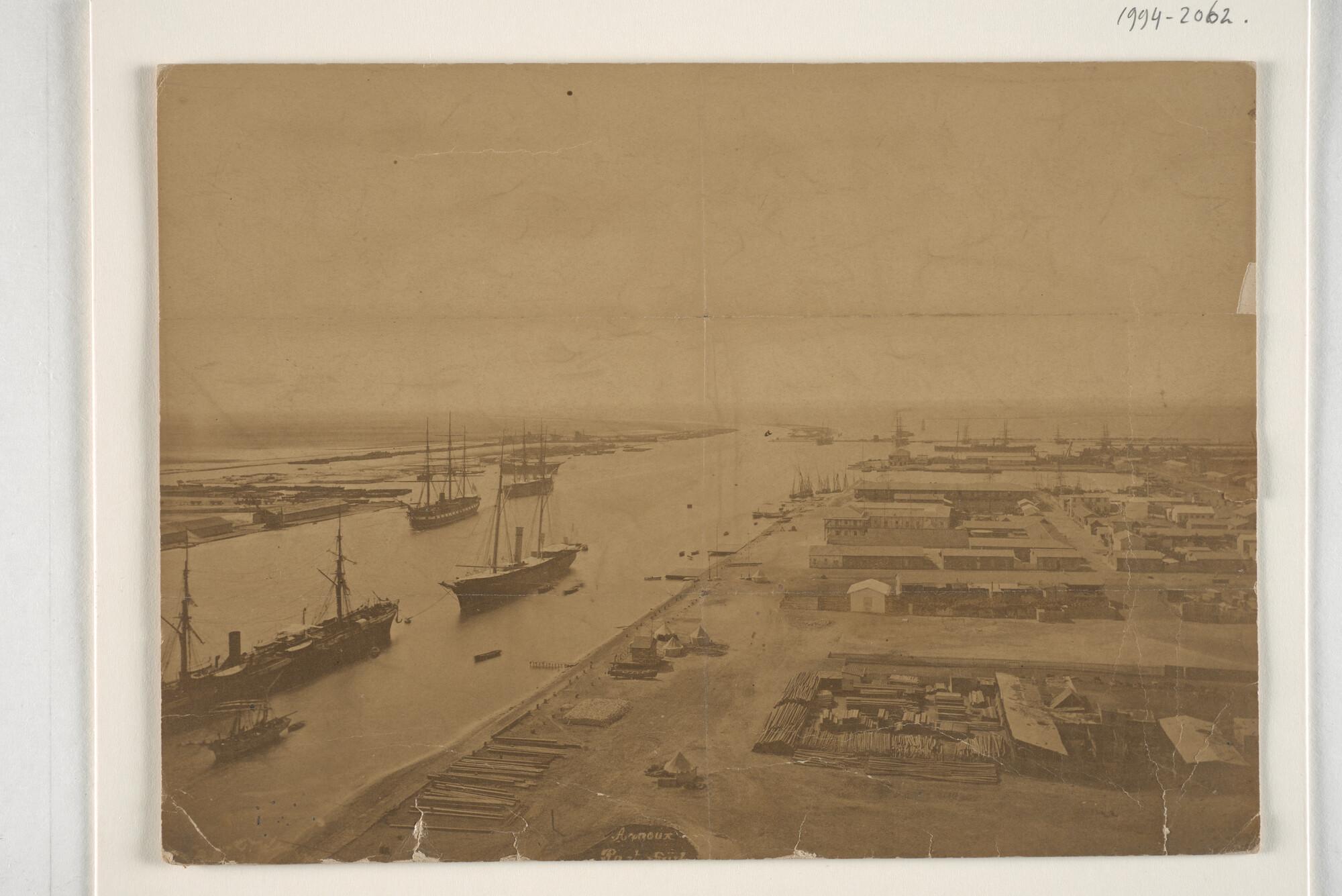 Gezicht op het Hotel Hollandais te port Saïd met het daarvoor afgemeerde ss. Prinses Amalia, gebouwd in 1874 bij John Elder & Co te Glasgow voor de Stoomvaart-Maatschappij "Nederland" (SMN)