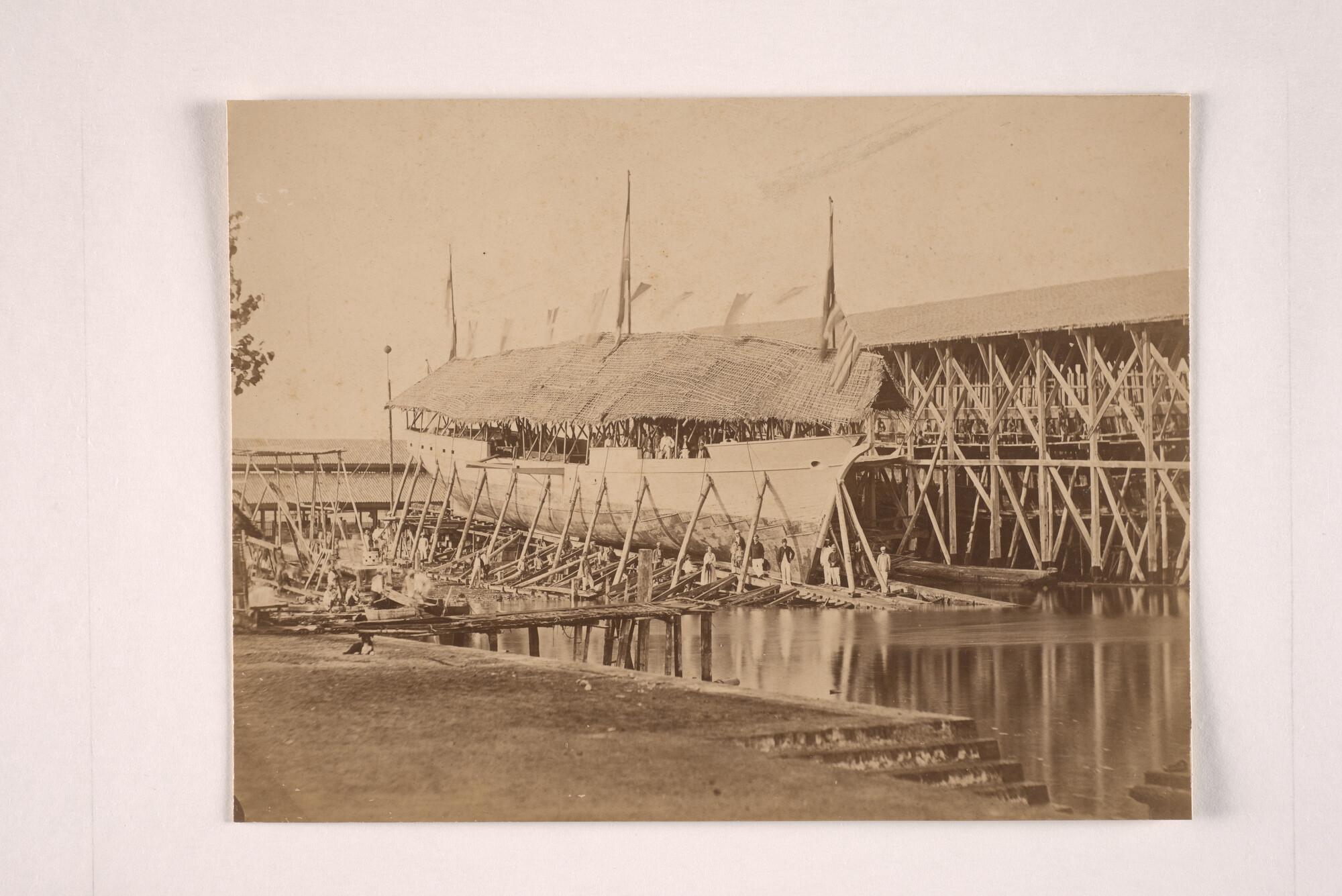 Het gouvernementsstoomvaartuig "Bronbeek", vlak voor de stapelloop bij de scheepswerf van Nering, Bögel en Dunlop in Dassoon bij Rembang (Java), 1862.