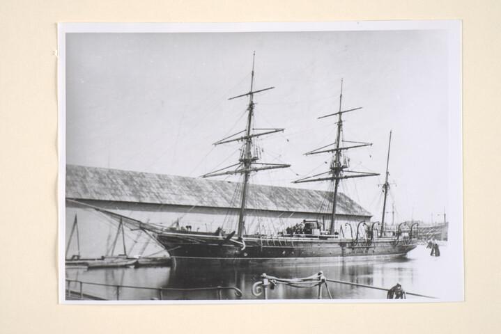 Het schroefstoomschip 3e klasse Hr.Ms. "Alkmaar" ligt afgemeerd bij de Rijkswerf in Amsterdam. Uiterst rechts is de "Bellona" in aanbouw. [Reproductiefoto]