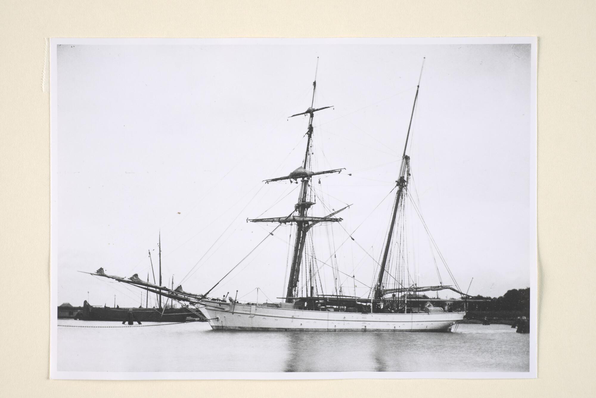 De schoenerbrik Zr.Ms. Blommendal vlak voor het vertrek uit Amsterdam, bakboordaanzicht. [Reproductiefoto]