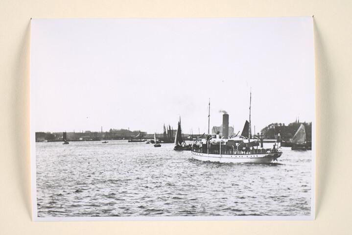 Het recherchevaartuig "Brak" bestemd voor de Gouvernements Marine, varende op het IJ in Amsterdam bij het vertrek naar Nederlands-Indië. [Reproductiefoto]