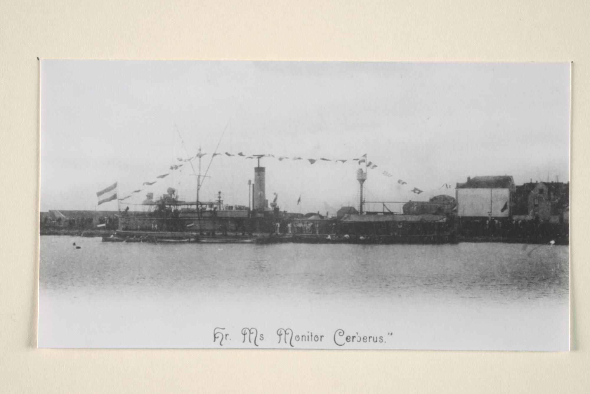 De monitor 2e klasse Hr.Ms. "Cerberus" afgemeerd in een (onbekende) Nederlandse haven. Het schip is gepavoisseerd, sloepen liggen langszij. [Reproductiefoto]