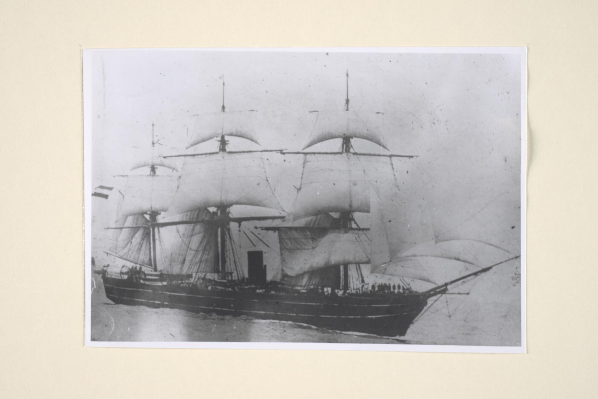 Het fregat met stoomvermogen Hr.Ms. "De Ruyter" met vol zeil op zee. [Reproductiefoto]