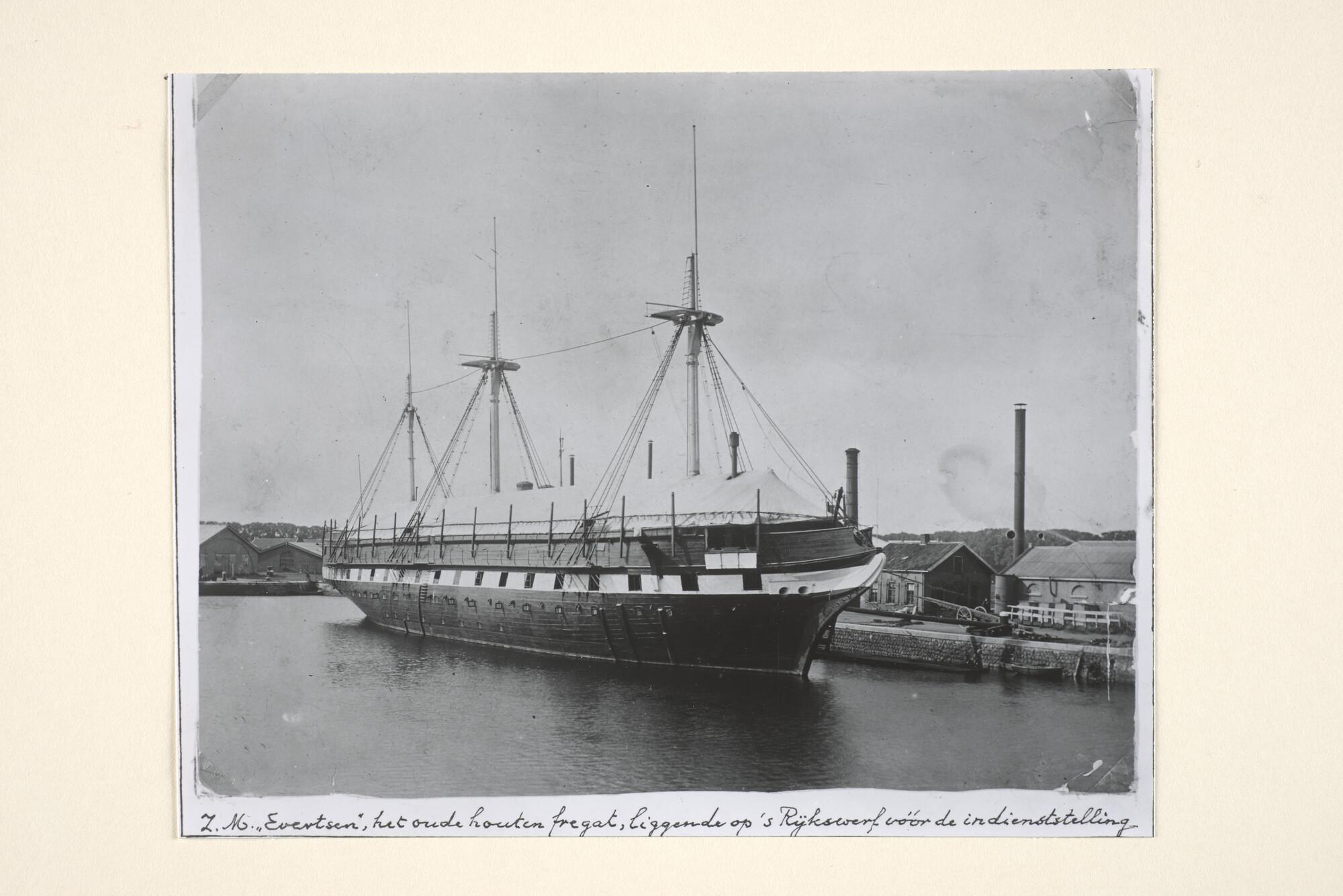 Het voormalige fregat Hr.Ms. "Evertsen" afgemeerd bij de Rijkswerf Willemsoord te Den Helder. [Reproductiefoto]