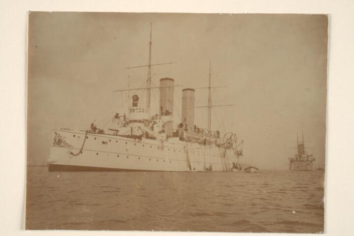 Pantserdekschepen op het Nieuwe Diep (Den Helder). Het voorste schip is de Hr.Ms. "Holland", waarvan aan bakboordzijde een sloep is gestreken (vooraanzicht).