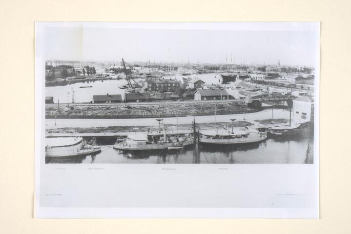 Stadsgezicht op Amsterdam: Het Oosterdok in Amsterdam gezien vanaf het Meteorologisch Instituut aan de kop van de Oostelijke Handelskade, circa 1894. Op de voorgrond liggen een drietal monitors. [Reproductiefoto]