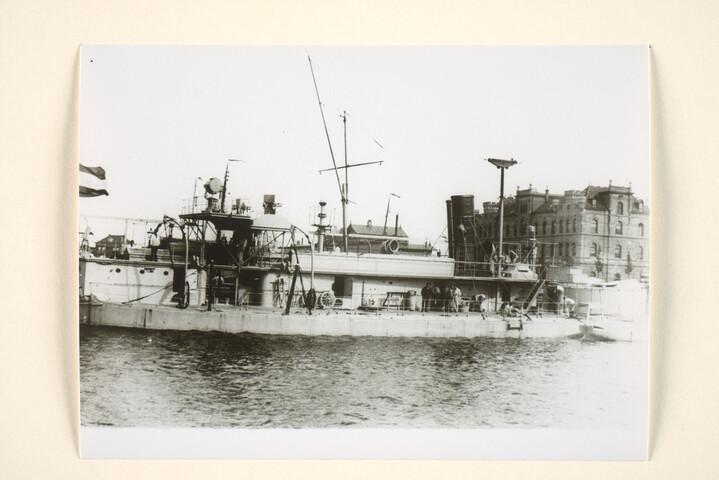 De monitor 2e klasse Hr.Ms. Tijger ligt afgemeerd aan De Ruyterkade in Amsterdam, stuurboordaanzicht. [Reproductiefoto]