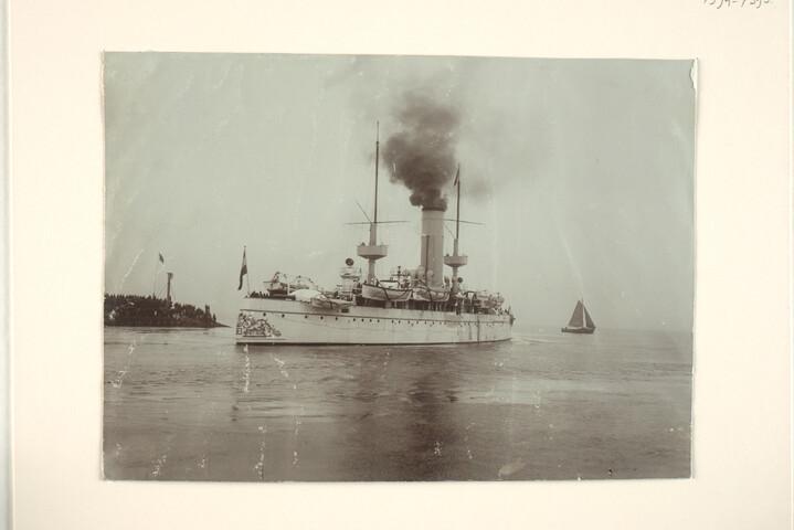 Het pantserschip Hr.Ms. Piet Hein verlaat het Nieuwe Diep