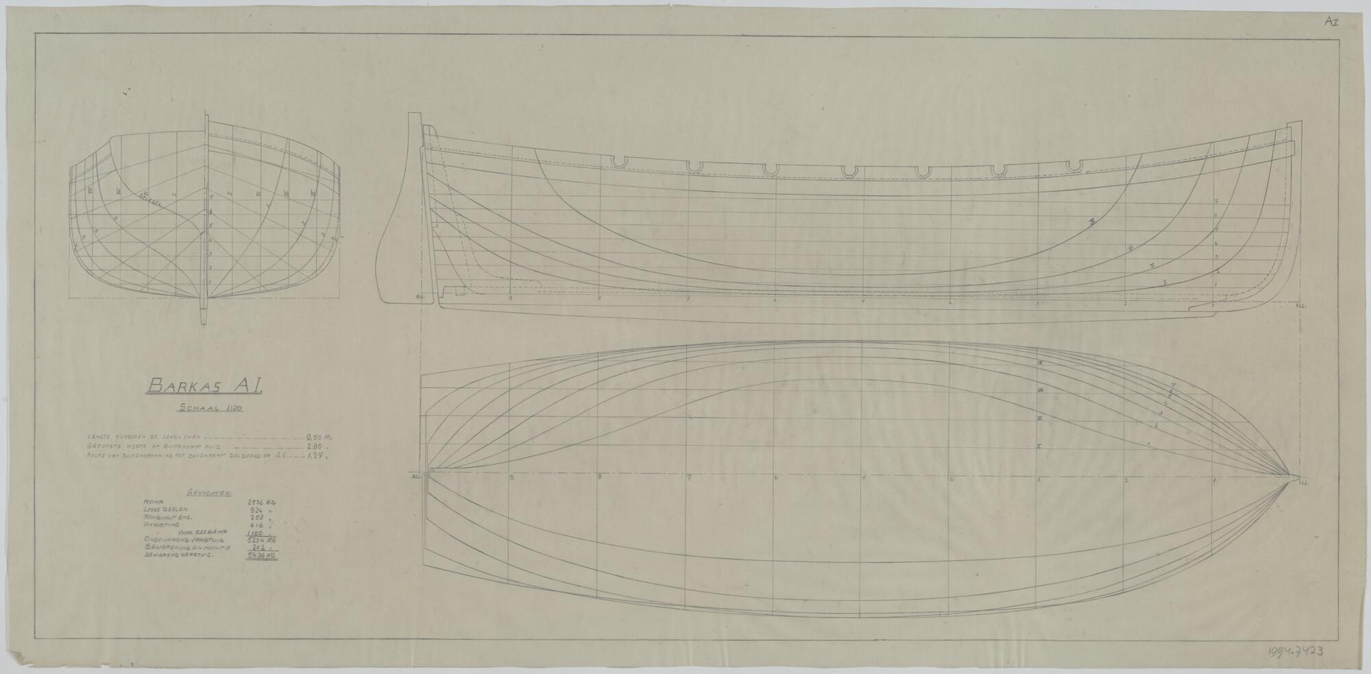 Lijnenplan van een A1-barkas (schaal 1 op 20).