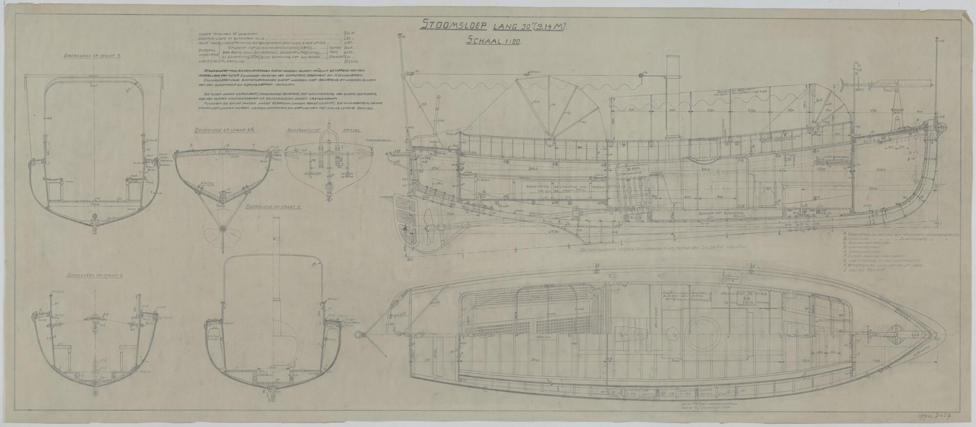 Constructietekening van 30' stoom- en motorsloepen (schaal 1 op 20).