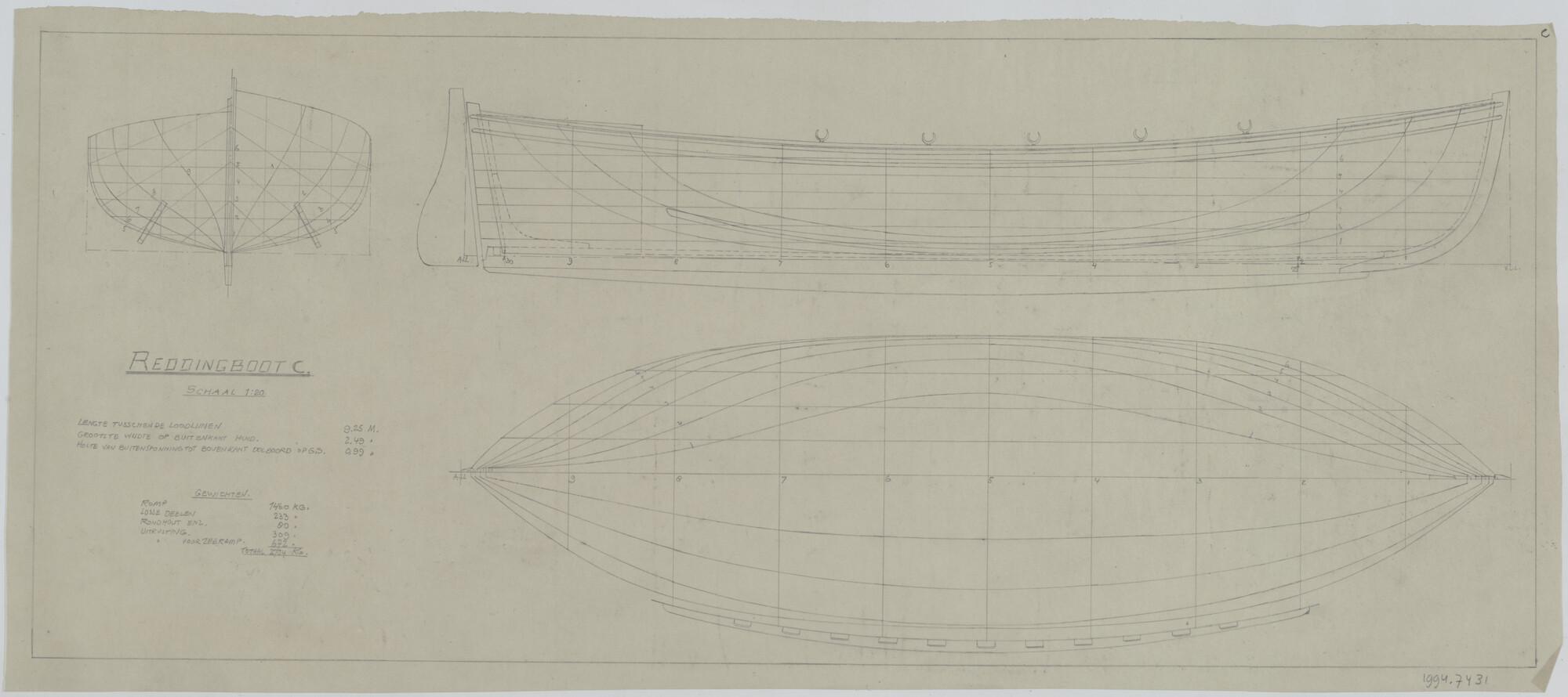 Lijnenplan van een C reddingboot (schaal 1 op 20).
