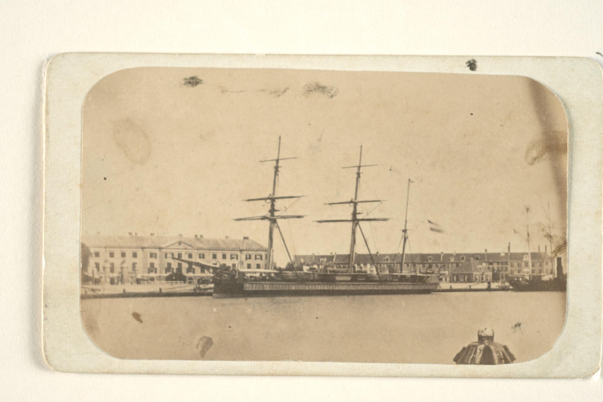 Het eerste ramtorenschip van de Koninklijke Marine, Zr.Ms. "Prins Hendrik der Nederlanden" afgemeerd aan het Nieuwe Diep in Den Helder.