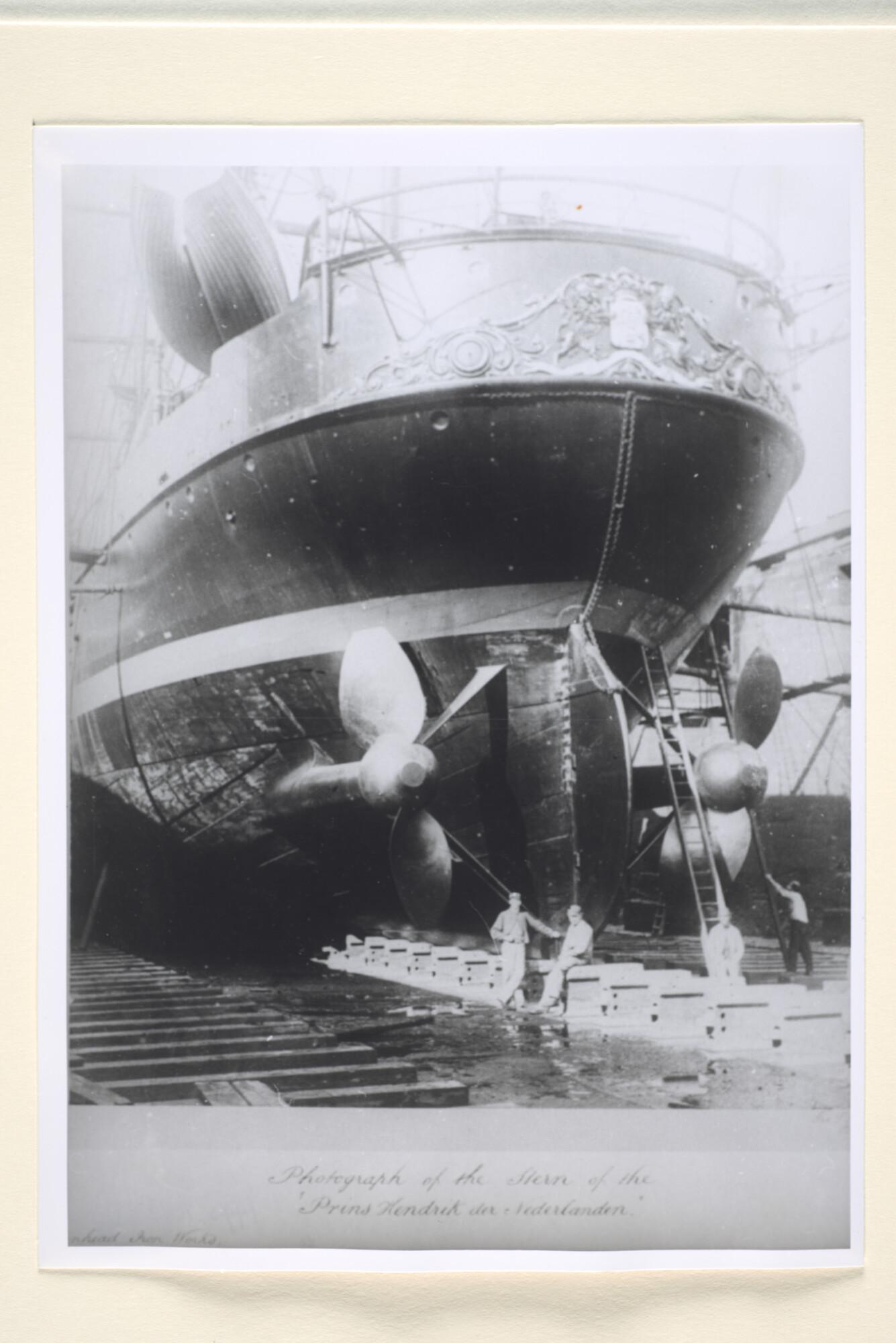 Reproductiefoto's van het eerste ramtorenschip van de Koninklijke Marine, Zr.Ms. Prins Hendrik der Nederlanden in het droogdok bij Gebr. Laird te Birkenhead, maart 1867.