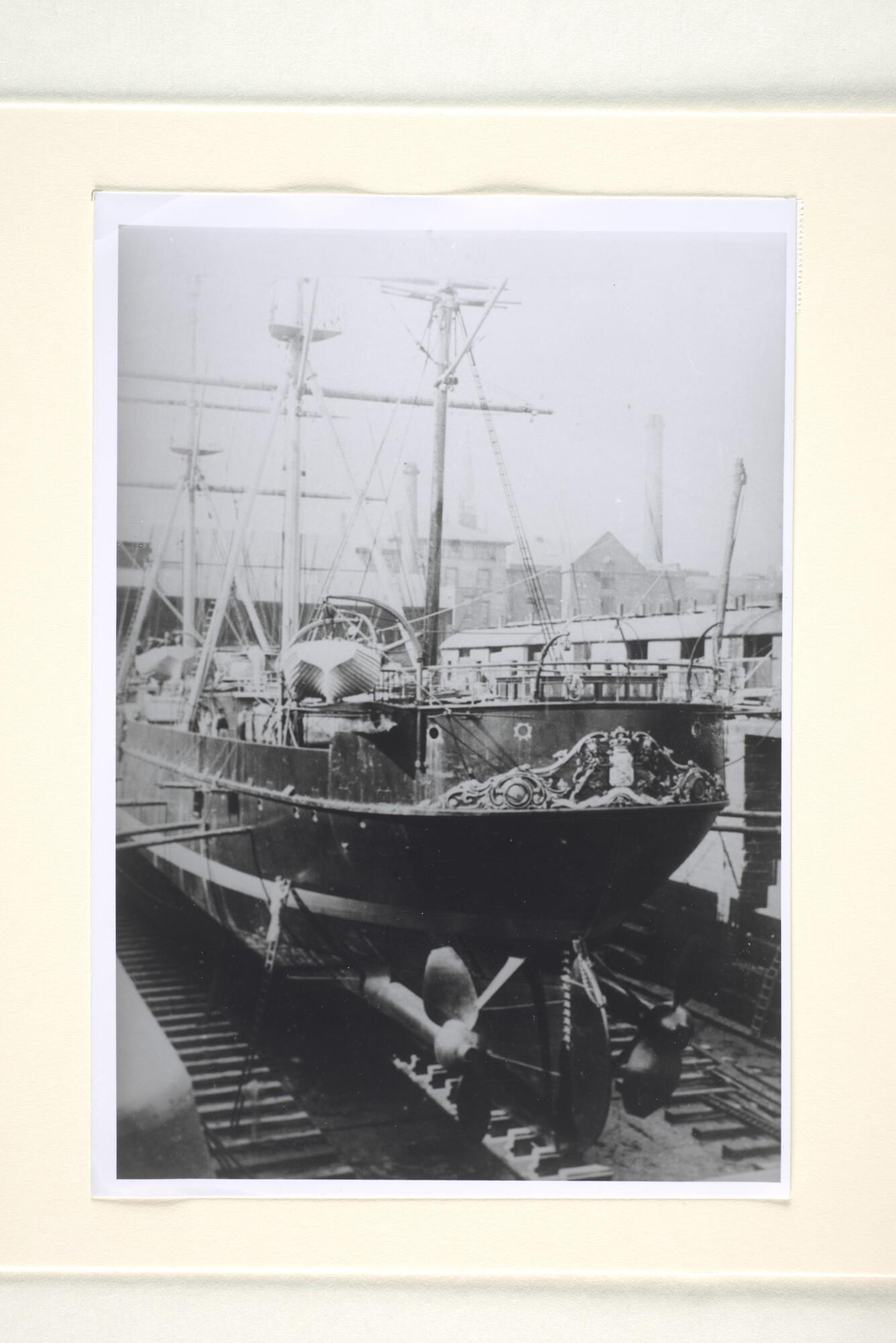 Reproductiefoto's van het eerste ramtorenschip van de Koninklijke Marine, Zr.Ms. Prins Hendrik der Nederlanden in het droogdok bij Gebr. Laird te Birkenhead