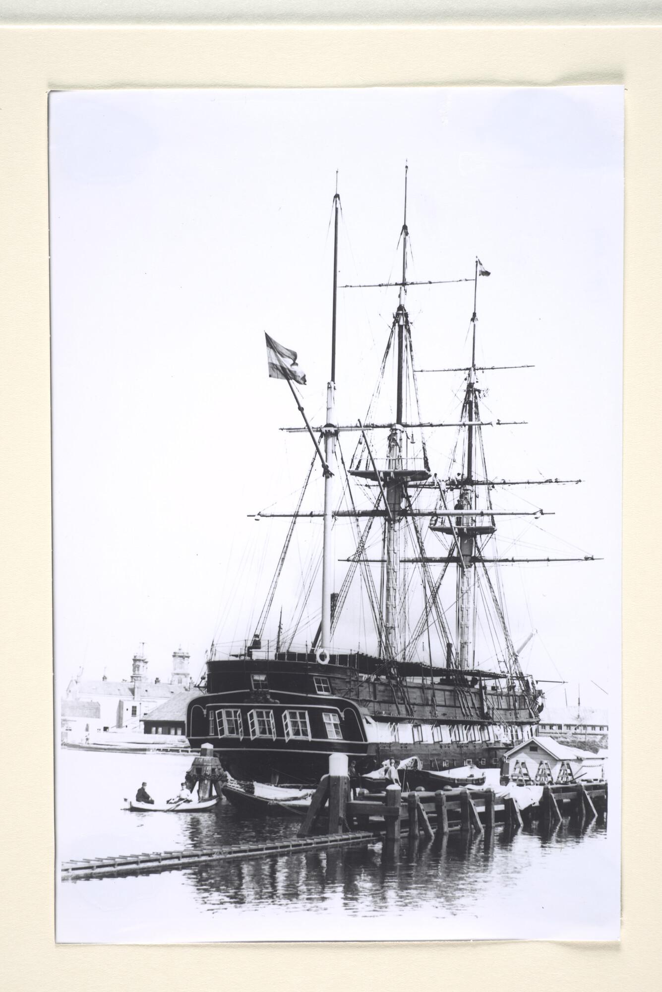 Het wachtschip Hr.Ms. Prins Maurits der Nederlanden (ex - Atalante) afgemeerd aan de Marinewerf in het Oosterdok te Amsterdam, augustus 1893 [Reproductiefoto]