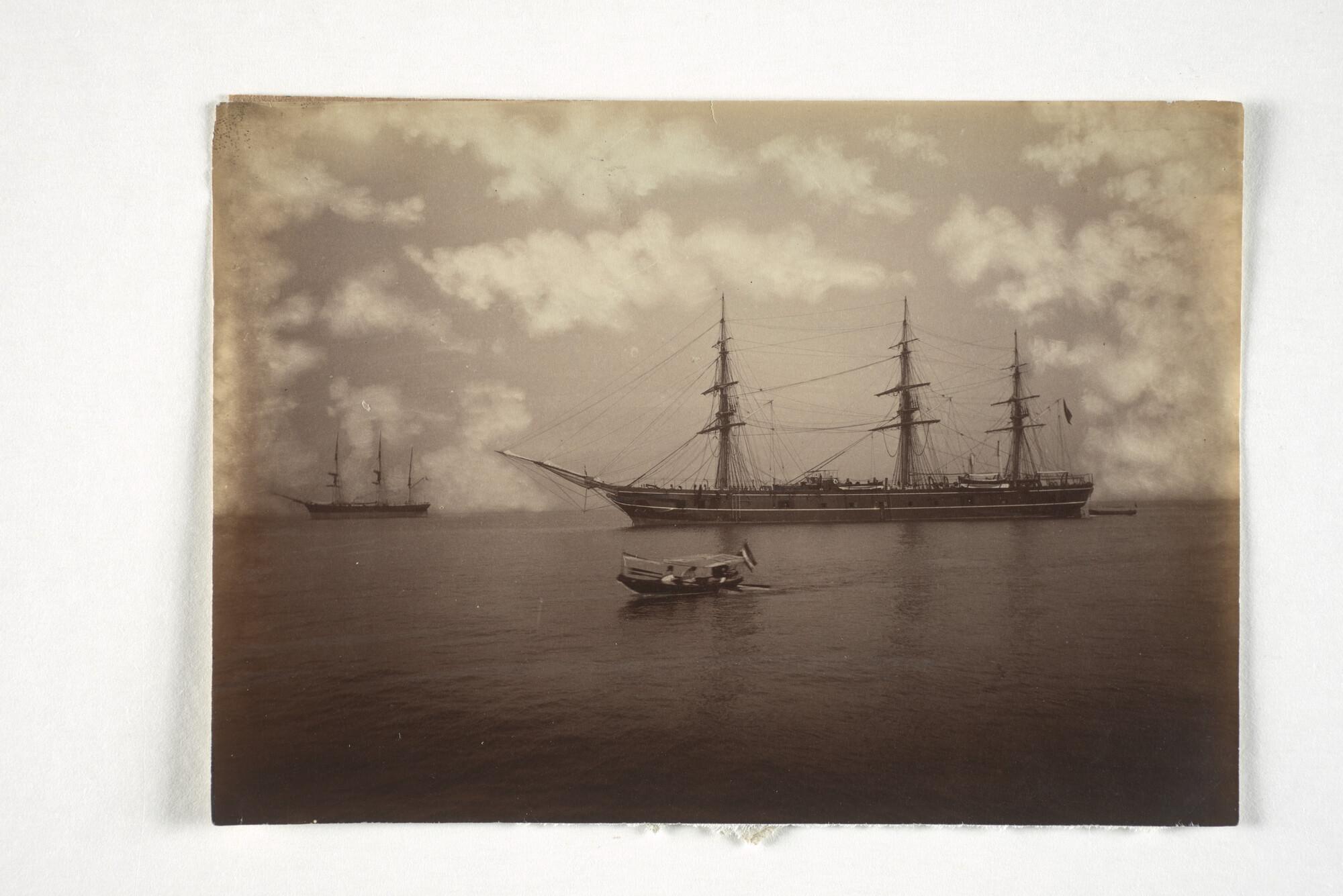 Het fregat Zr.Ms. "Tromp" ligt, met ingetrokken schoorstenen, op een onbekende rede voor anker. Links op de achtergrond ligt een ander oorlogsschip, een roeiboot op de voorgrond nadert de kust.