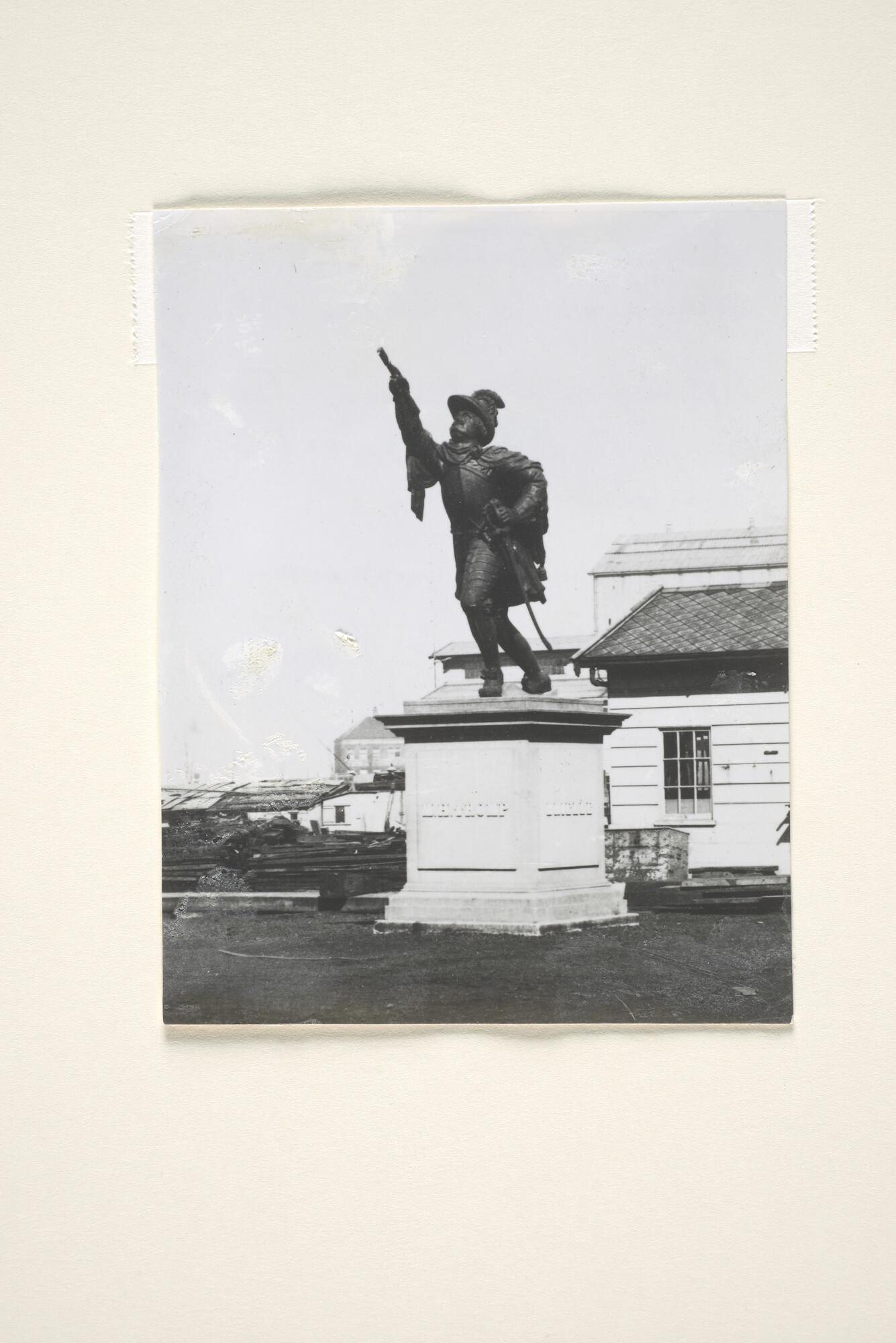 Het schegbeeld van Maarten Harpertsz Tromp, geplaatst op een sokkel, op de Rijkswerf te Amsterdam. Afkomstig van het linieschip Zr.Ms. "Tromp". Het beeld is in de Tweede Wereldoorlog verloren gegaan. [Reproductiefoto]