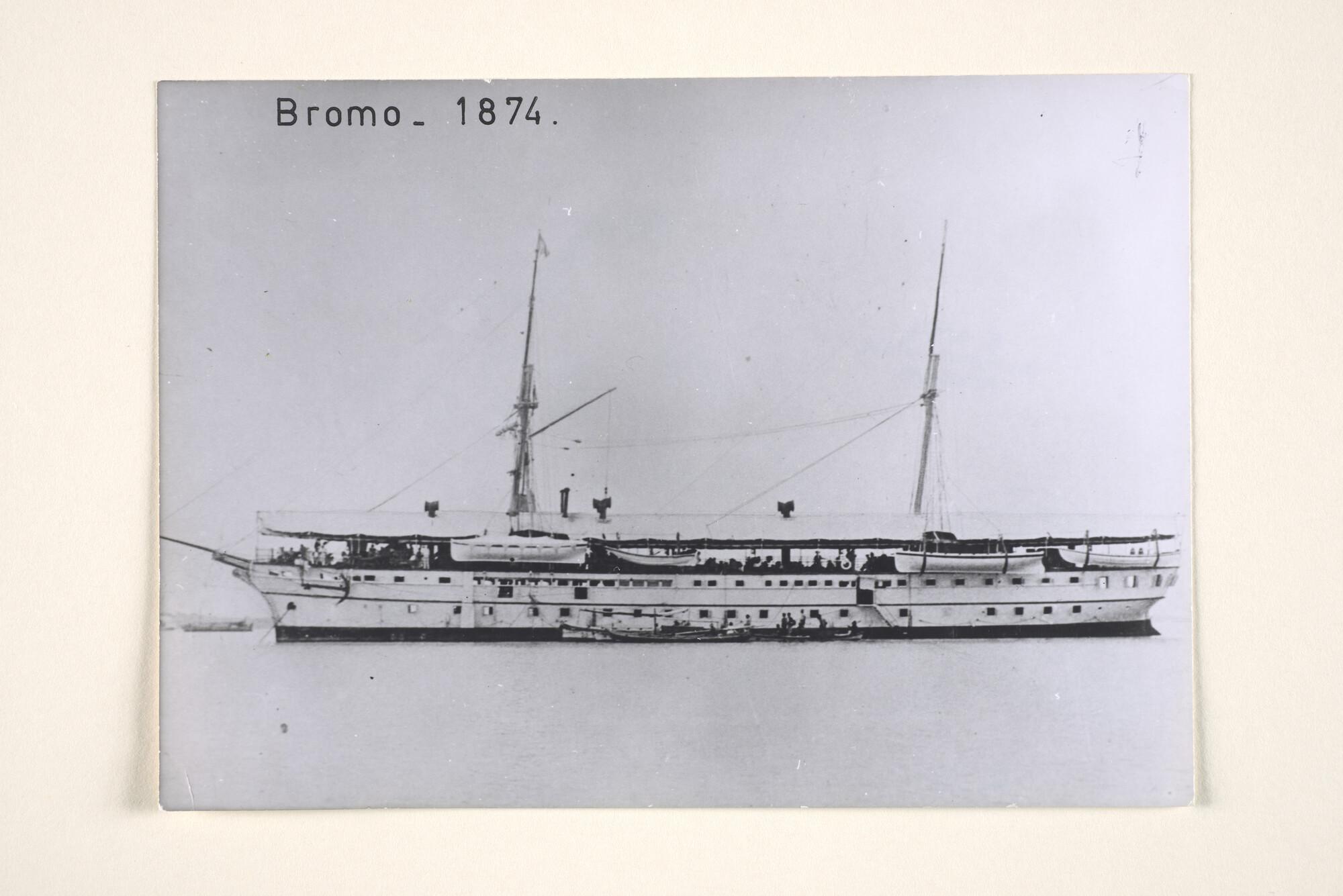 Het raderstoomschip 2e klasse Hr.Ms. Bromo voor anker liggende op een Indische rede, bakboordaanzicht. [Reproductiefoto]