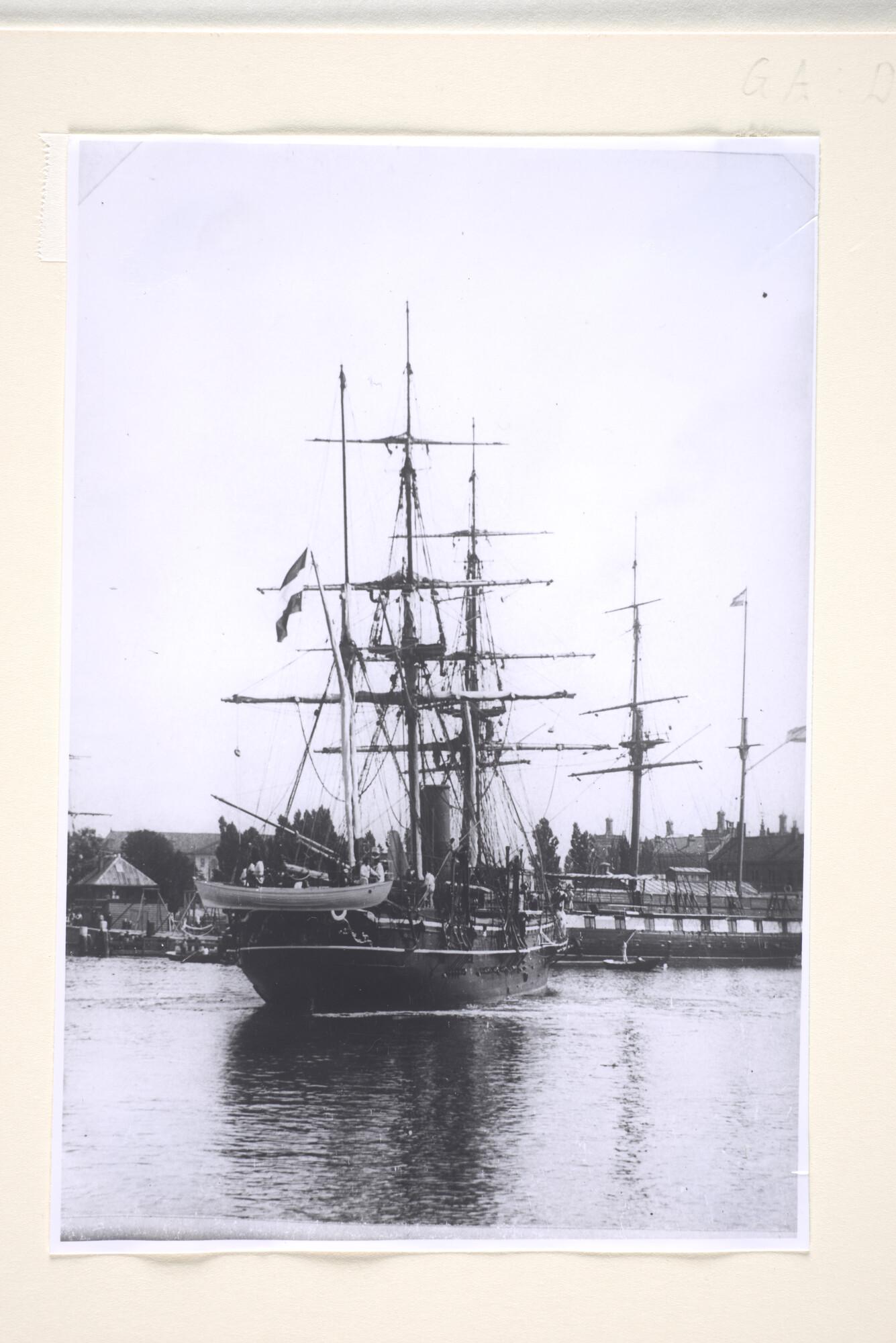 Het korvet Hr.Ms. "Alkmaar" legt aan bij het Marine Etablissement te Amsterdam, juni 1895. (Achteraanzicht). [Reproductiefoto]