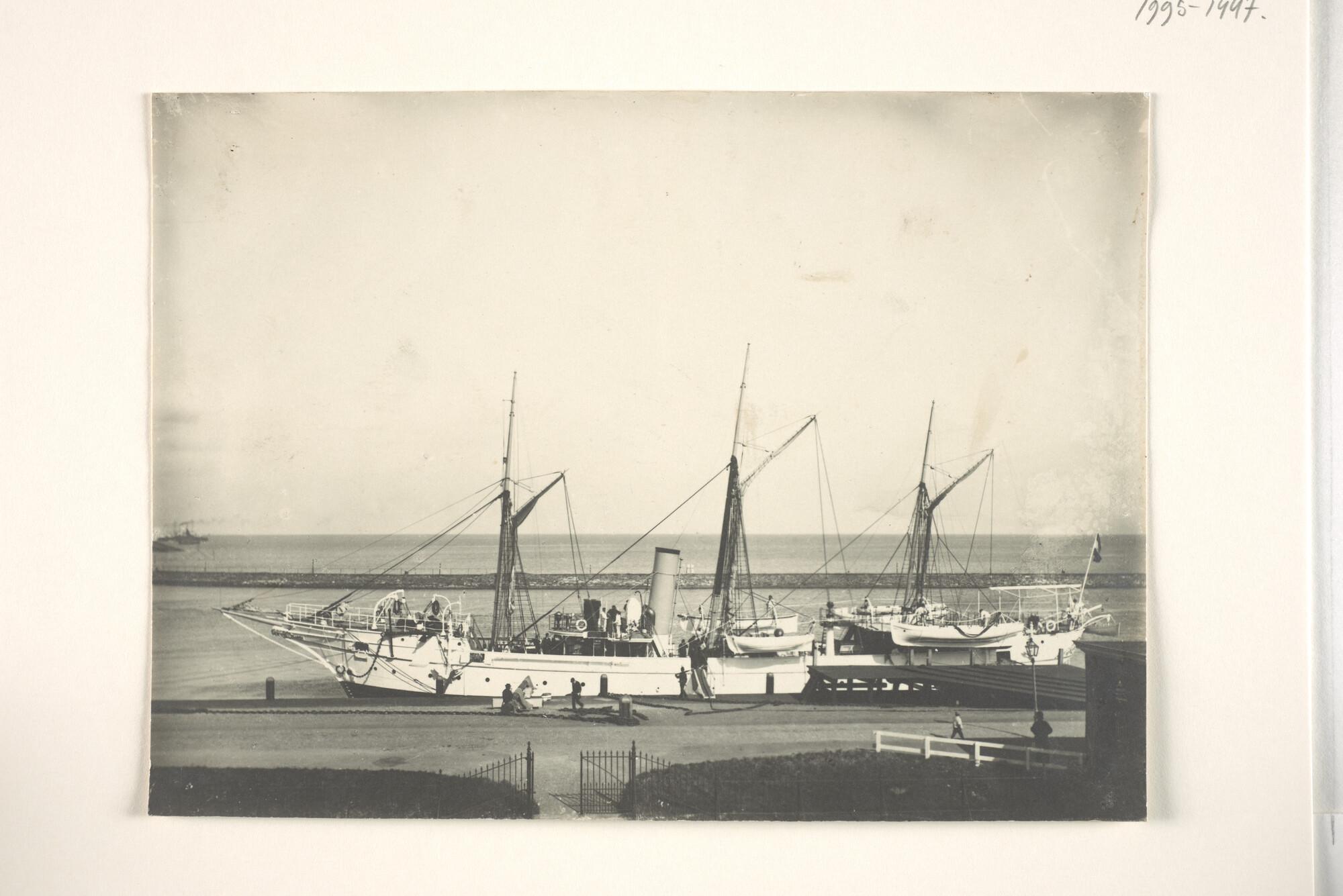De schoener voor het toezicht op de visserij Hr.Ms. Zeehond afgemeerd aan de kade van het Nieuwe Diep (Den Helder) vermoedelijk in 1895.
