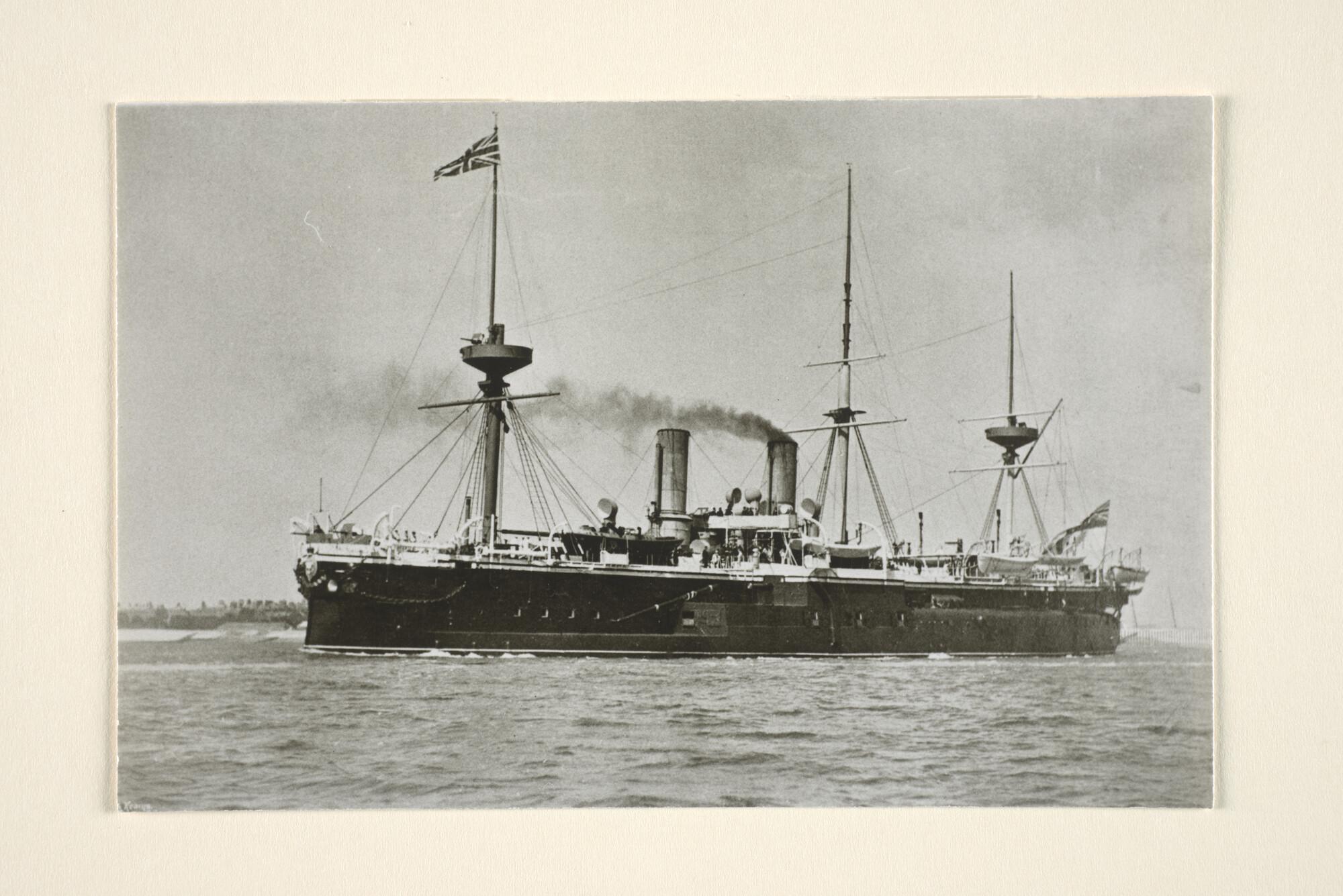 Het Britse torendekschip HMS "Alexandra", bakboordaanzicht. [Reproductiefoto]
