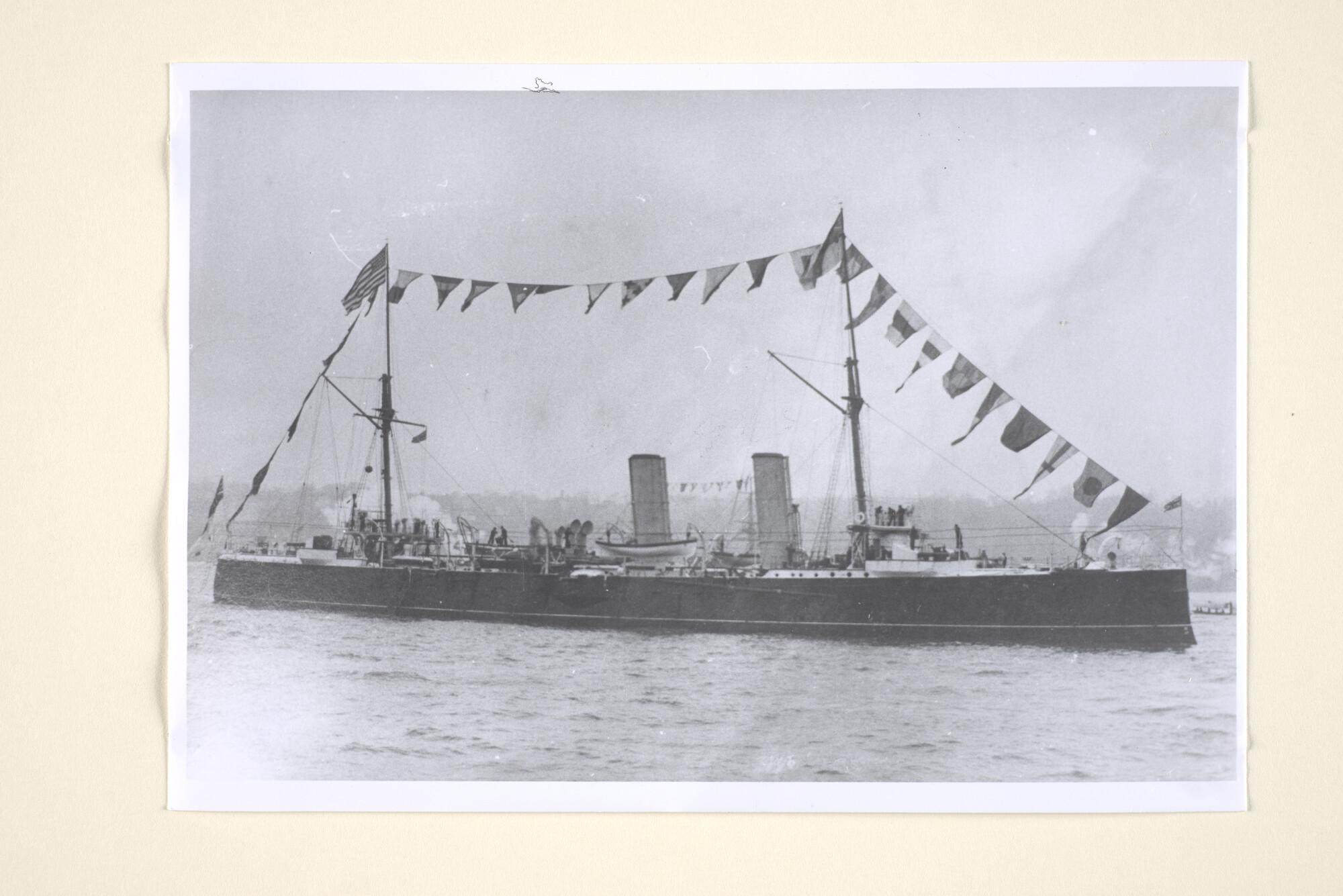De Britse pantserkruiser HMS Fartar tijdens een vlootbezoek aan de USA, stuurboordaanzicht. [Reproductiefoto]