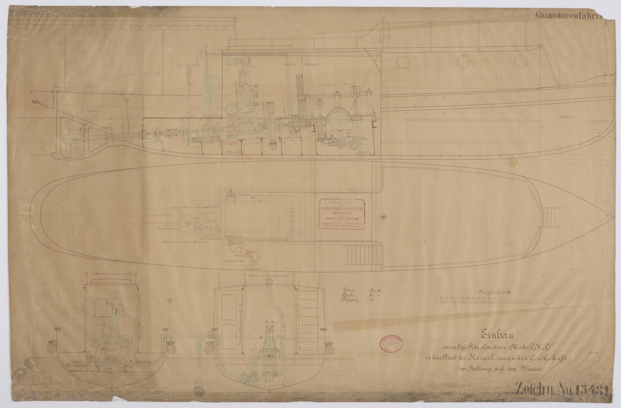 Algemeen plan met inbouw petroleummotor en brandbluspomp voor brandblusboot