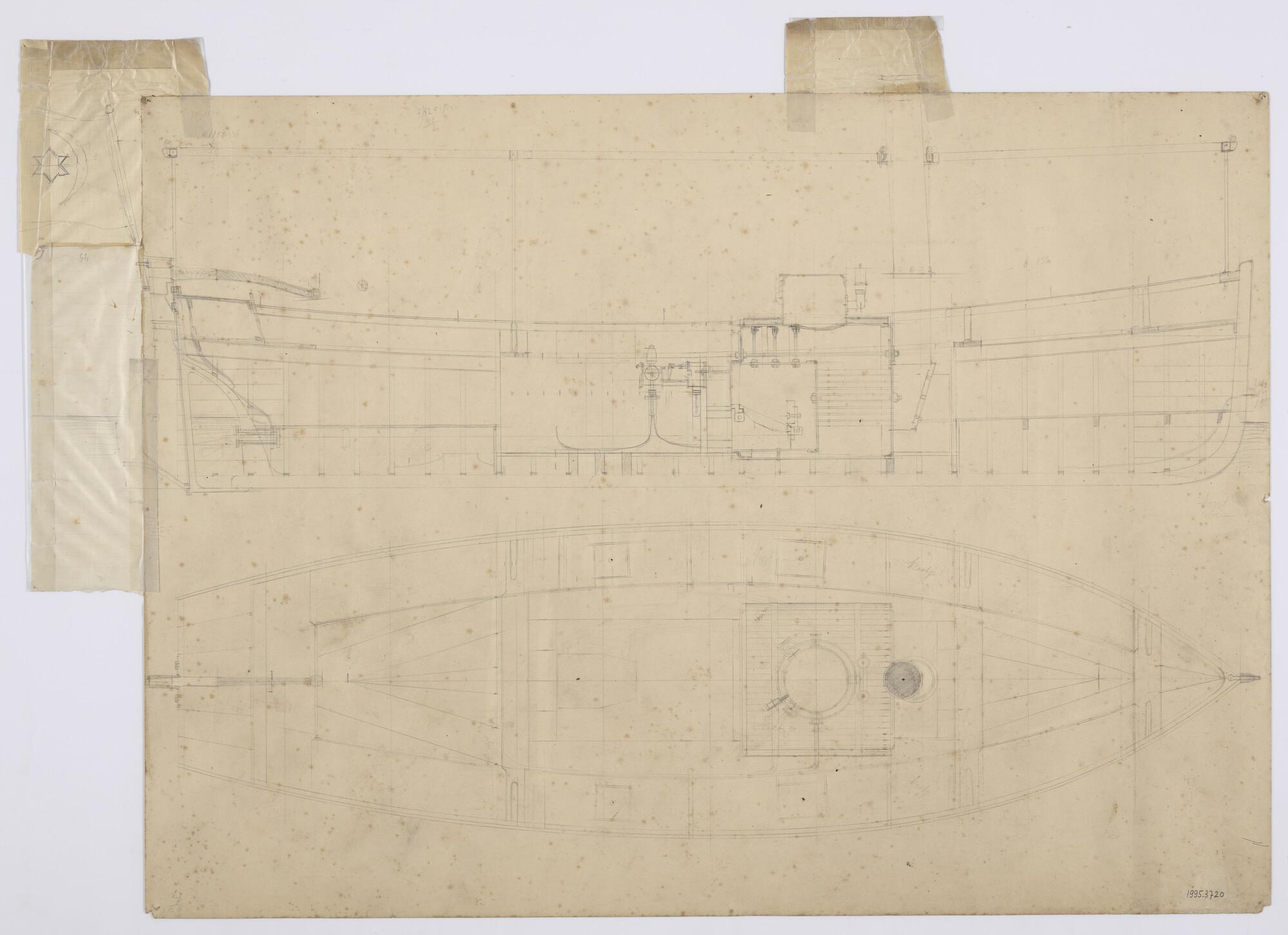 Algemeen plan van een houten stoomsloep (schaal 1:10).