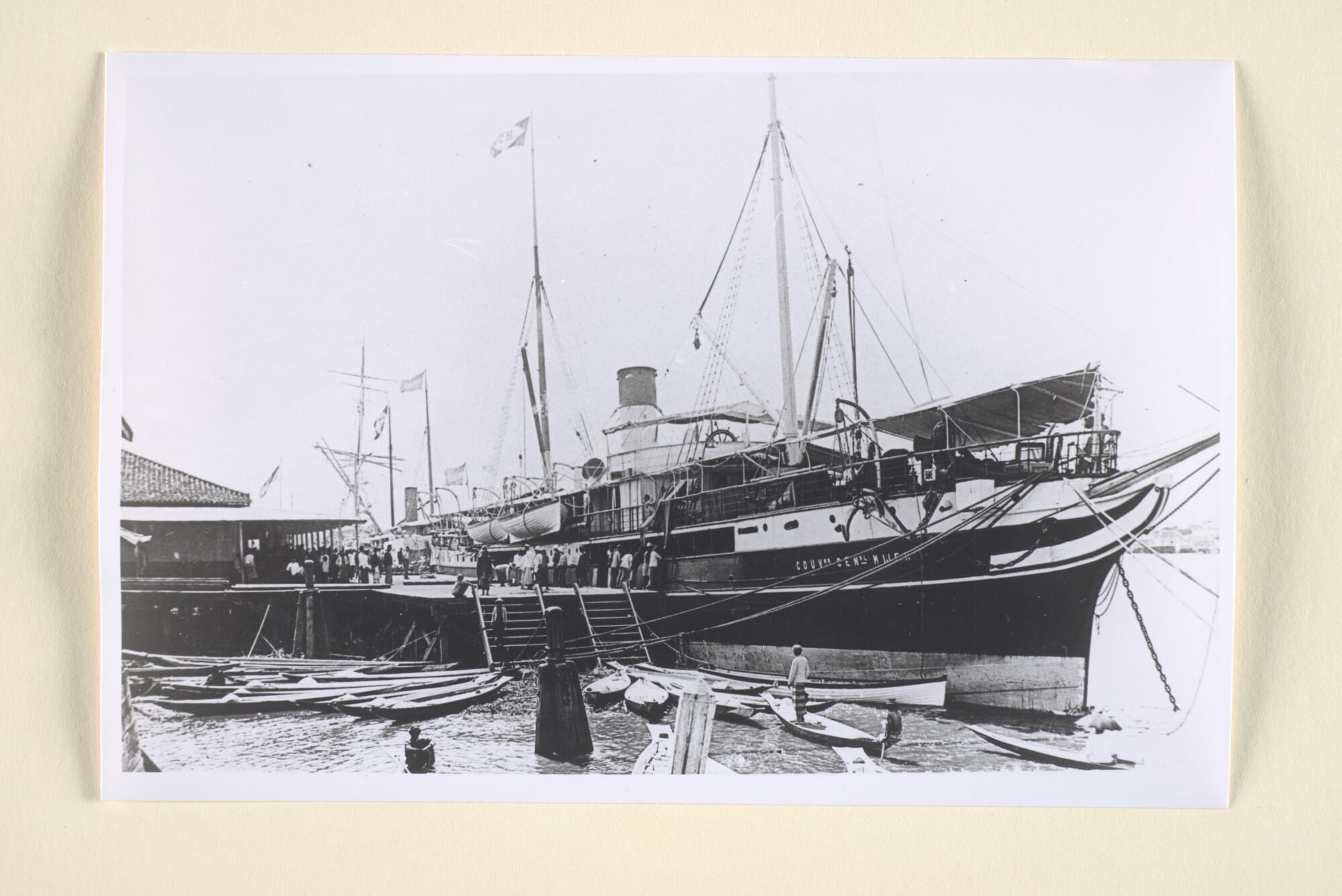 Het stoomschip "Gouverneur Generaal Meijer" van de Koninklijke Paketvaart-Maatschappij [in 1891 gekocht van de Nederlandsch-Indische Stoomvaart-Maatschappij] ligt afgemeerd aan een steiger in de Indische archipel.
