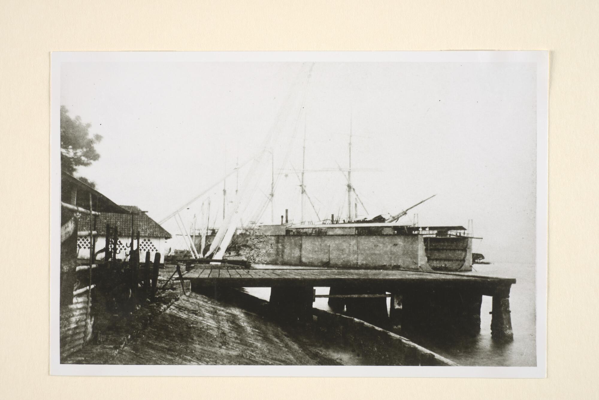 Reproductiefoto: de clipper "Kosmopoliet III" eigendom van Gebroeders Blussé [gebouwd in 1871 bij C. Gips & Zn. Dordrecht] ligt voor reparatie in het droogdok bij Onrust.