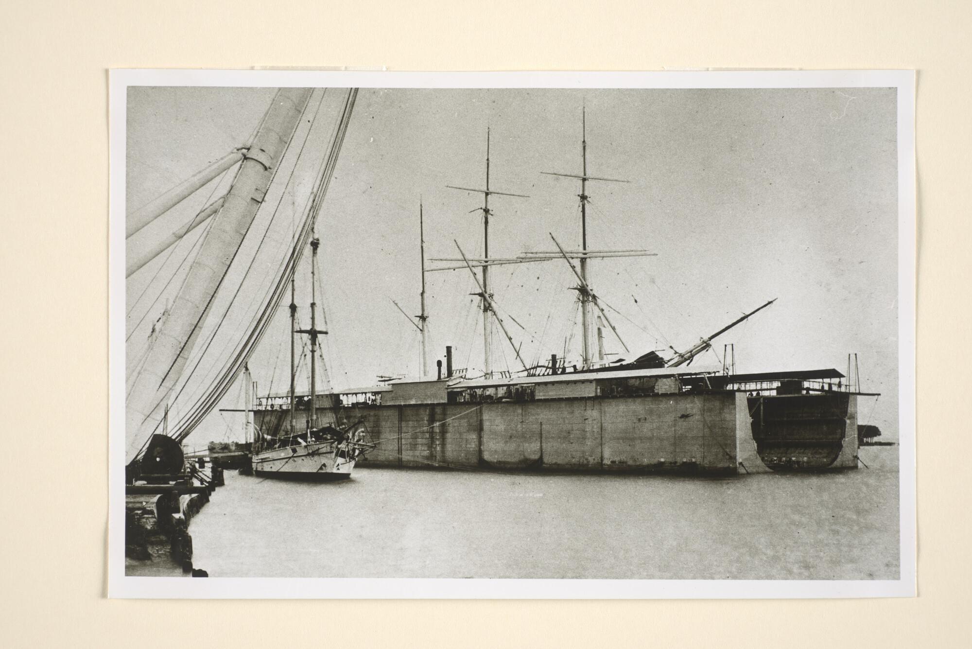 Reproductiefoto: de clipper "Kosmopoliet III" eigendom van Gebroeders Blussé [gebouwd in 1871 bij C. Gips & Zn. Dordrecht] ligt voor reparatie in het droogdok bij Onrust. Links ligt Zr.Ms. "Melvill van Carnbee".