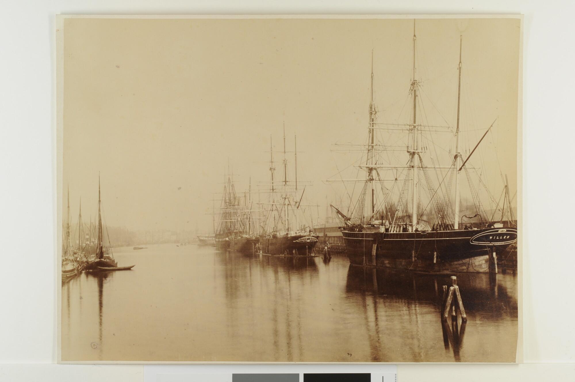 De driemast houten bark Willem (ex- Rotterdam) van W.A. Huygens [gebouwd in 1866 bij Gebr. Pot te Nieuw Lekkerland] gezien in het Oosterdok tussen andere zeilschepen.