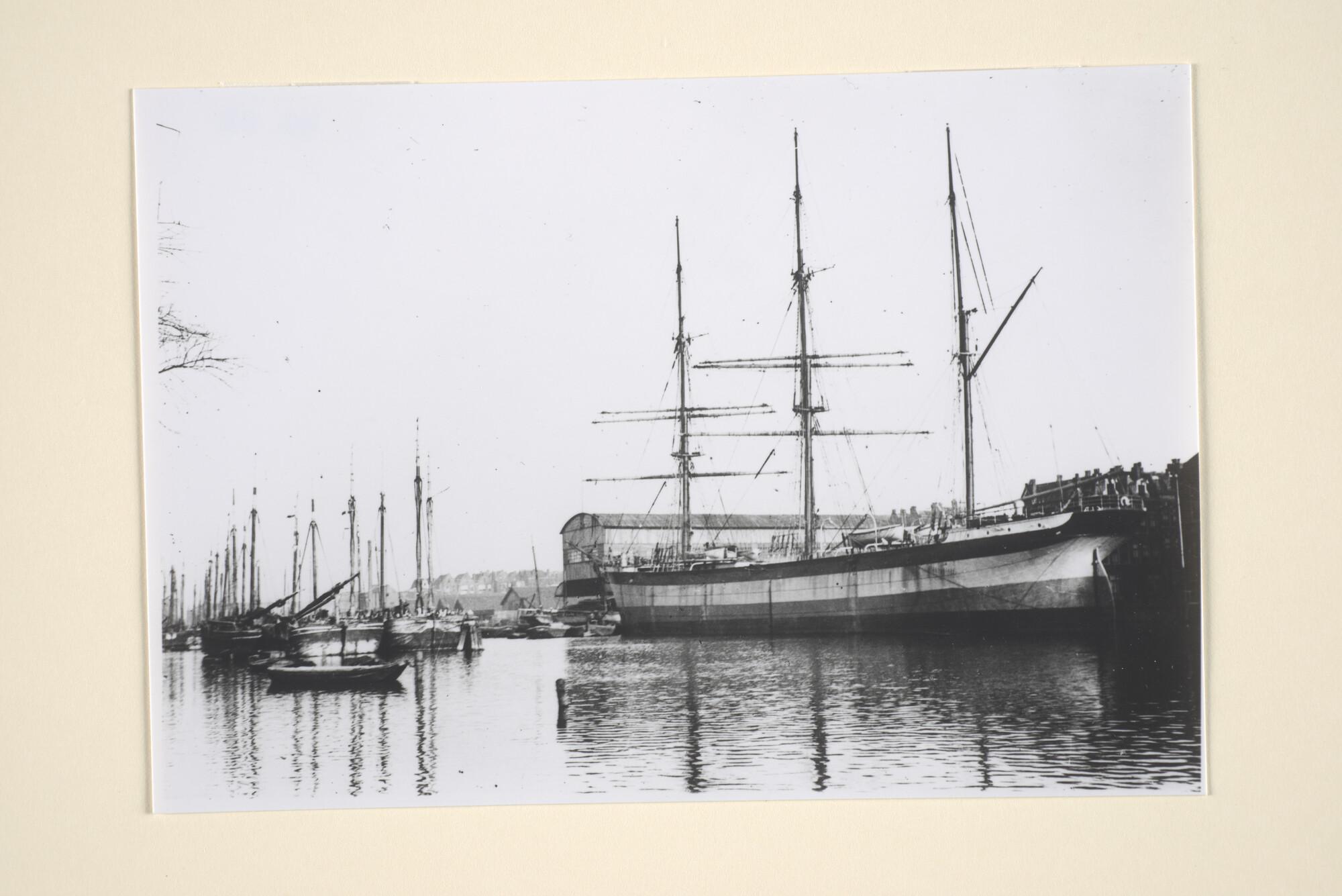 De driemast stalen bark "Willem Eggerts" [gebouwd in 1885 bij McIntyre aan de Clyde] van houthandel Brantjes & Co. te Purmerend ligt afgemeerd aan de Kattenburgergracht bij werf De Boot. [Reproductiefoto]